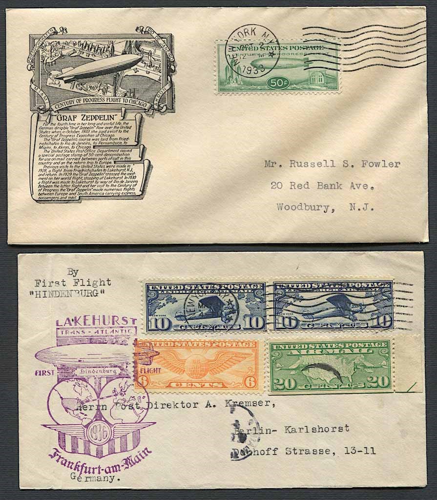 50 cent. green, Air Post (Scott C18) on FDC to Woodbury, N. J.; “First Flight Hindemburg”, 10 cent. dark blue (2), 20 cent. yellow-green, 6 cent. dull-orange (Scott C9, C10, C19) on cover with special violet handstamp. Backstamped “Frankfurt (main) 14.5.34-8-9-b” circular date stamp and “Berlin C - 14.5.36” (Siegel 409C).