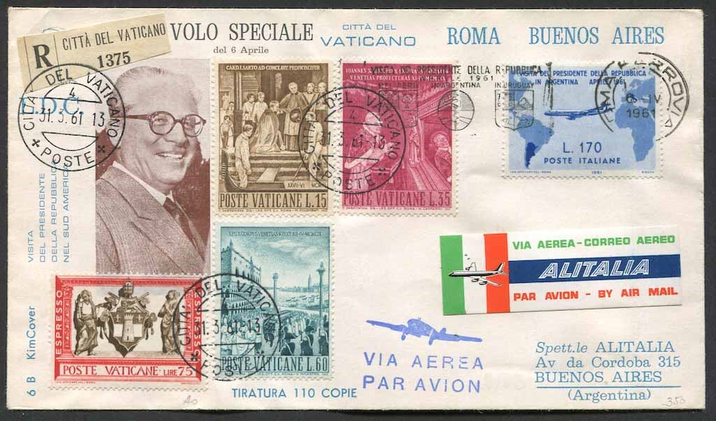 Affrancati ognuno con un valore in tariffa, dei francobolli emessi per la visita del Presidente Gronchi in Sud America (S. 918/920). + affrancature supplementari con francobolli di Vaticano. Non comuni.