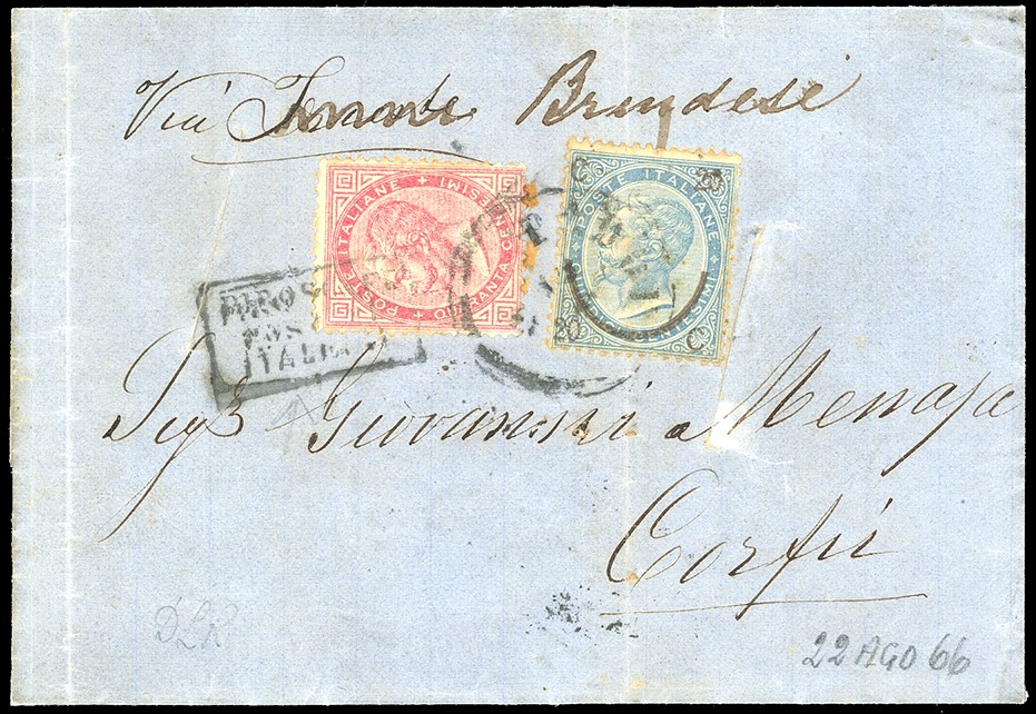Affrancata in tariffa di primo porto per 60 centesimi con 20 c. su 15 c. terzo tipo e un 40 centesimi DLR (S. T20, 25). Manoscritto “Via di Trieste” cancellato e aggiunto “Brindisi”, essendo Trieste ancora austriaca. Bollo riquadrato “Piroscafi Postali Italiani” applicato a Brindisi e al verso bollo di transito del 27 agosto e di arrivo a Corfù del 22 agosto (Calendario Giuliano). Primi usi dei francobolli italiani nelle località liberate nel luglio 1866. La lettera fu trasportata con un vapore della Compagnia Peirano & Danovaro che dal 1862 gestiva per conto dell’Amministrazione Postale Italiana la linea settimanale tra Napoli e Ancona, effettuando anche lo scalo di Corfù. Il conflitto tra Italia e Austria del 1866 complicò la situazione perché il servizio Lloydiano fu sospeso dal 24 giugno al 13 settembre per cui veniva a mancare il mezzo di collegamento tra l’area italiana e quella greca. Non per questo la Peirano & Danovaro rinunciò alla propria attività.