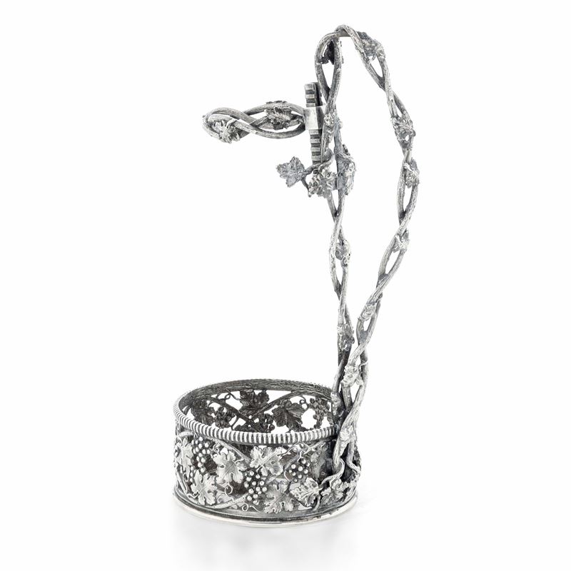Portabottiglia con decoro a tralci di vite. Argenteria artistica italiana del XX secolo. Argentiere Cesa, Alessandria