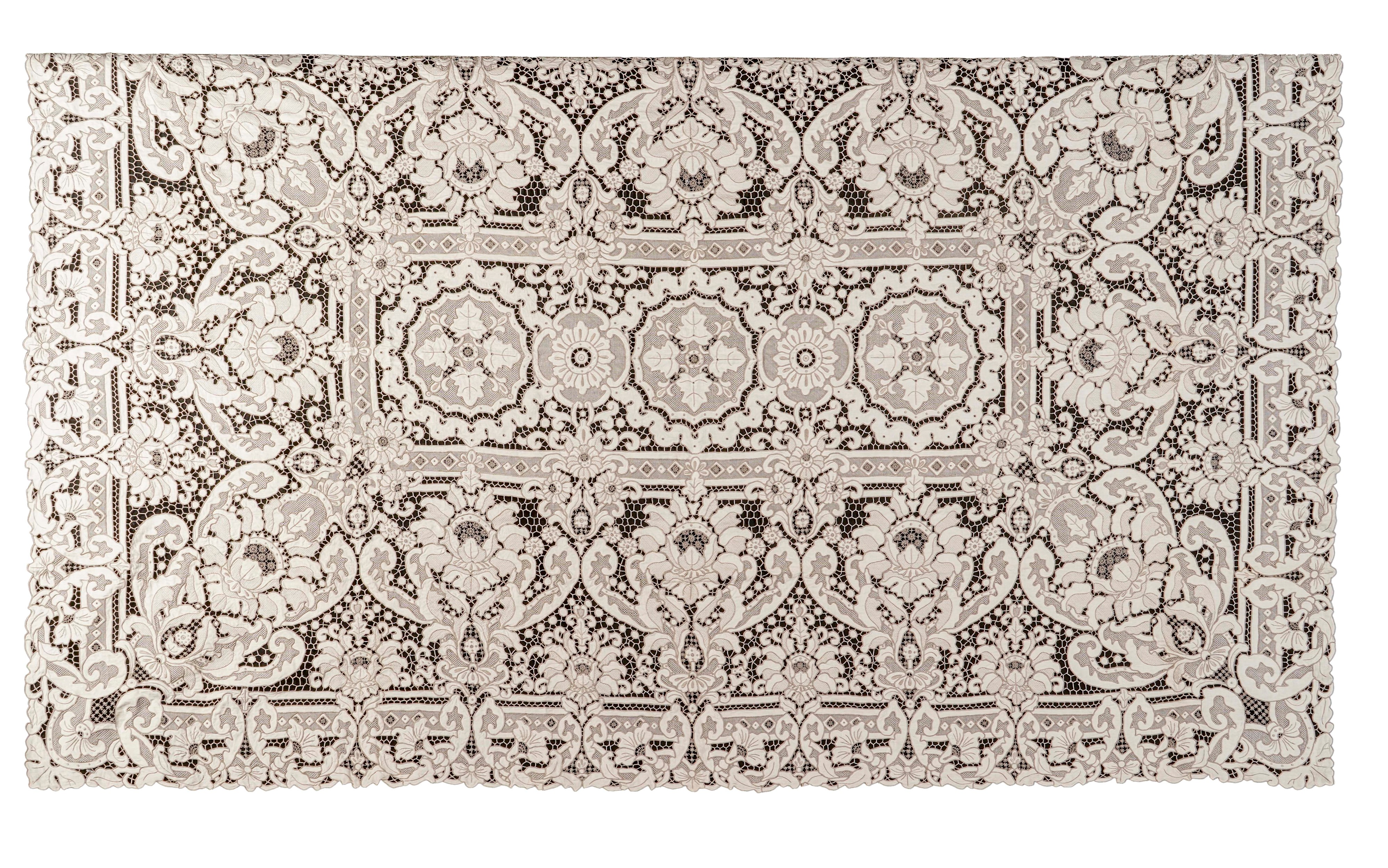 In lino, interamente in pizzo ecru e ricami. Dimensioni: cm 243x168. Conservazione: ottima
