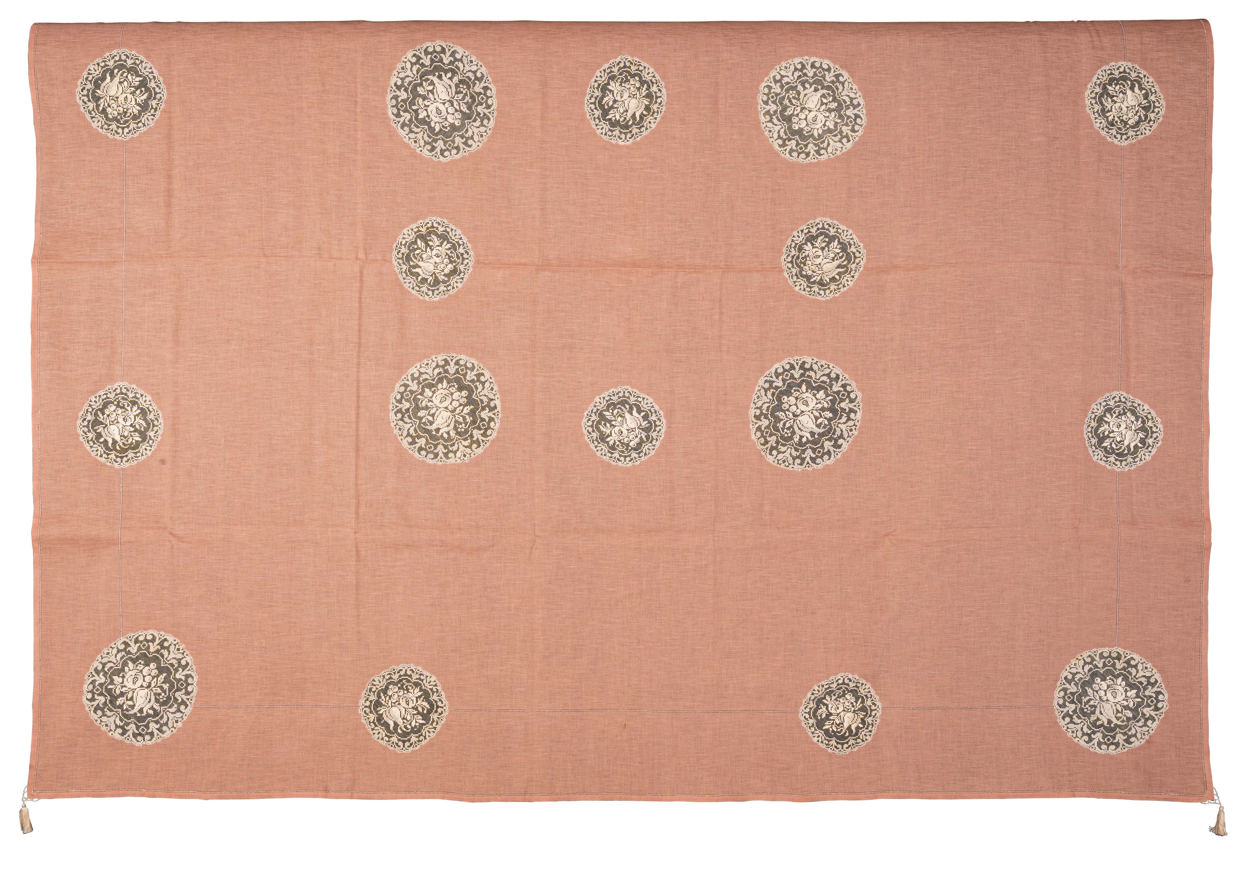 in lino rosa con filet color avorio. Dimensioni: cm 222x198; tovaglioli cm 46x46. Conservazione: ottima