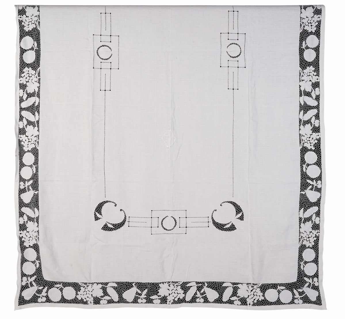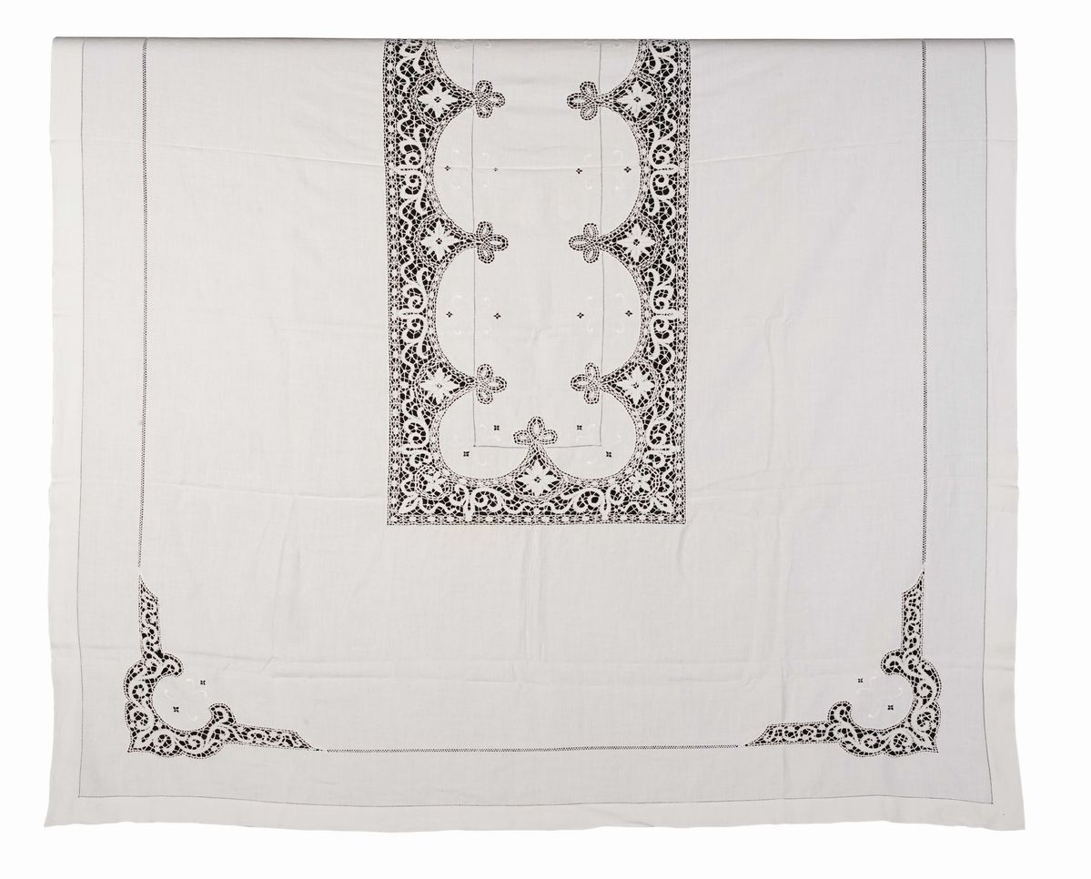 In lino bianco con inserti di pizzo e ricami. Dimensioni: tovaglia cm 277x193; tovaglioli cm 59x58. Conservazione: ottima; qualche tovagliolo con insignificanti macchie