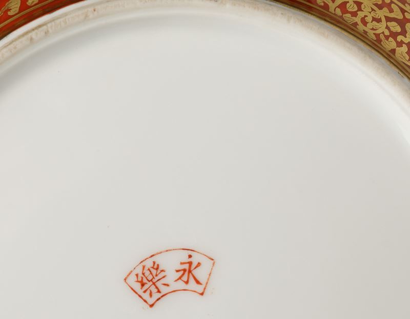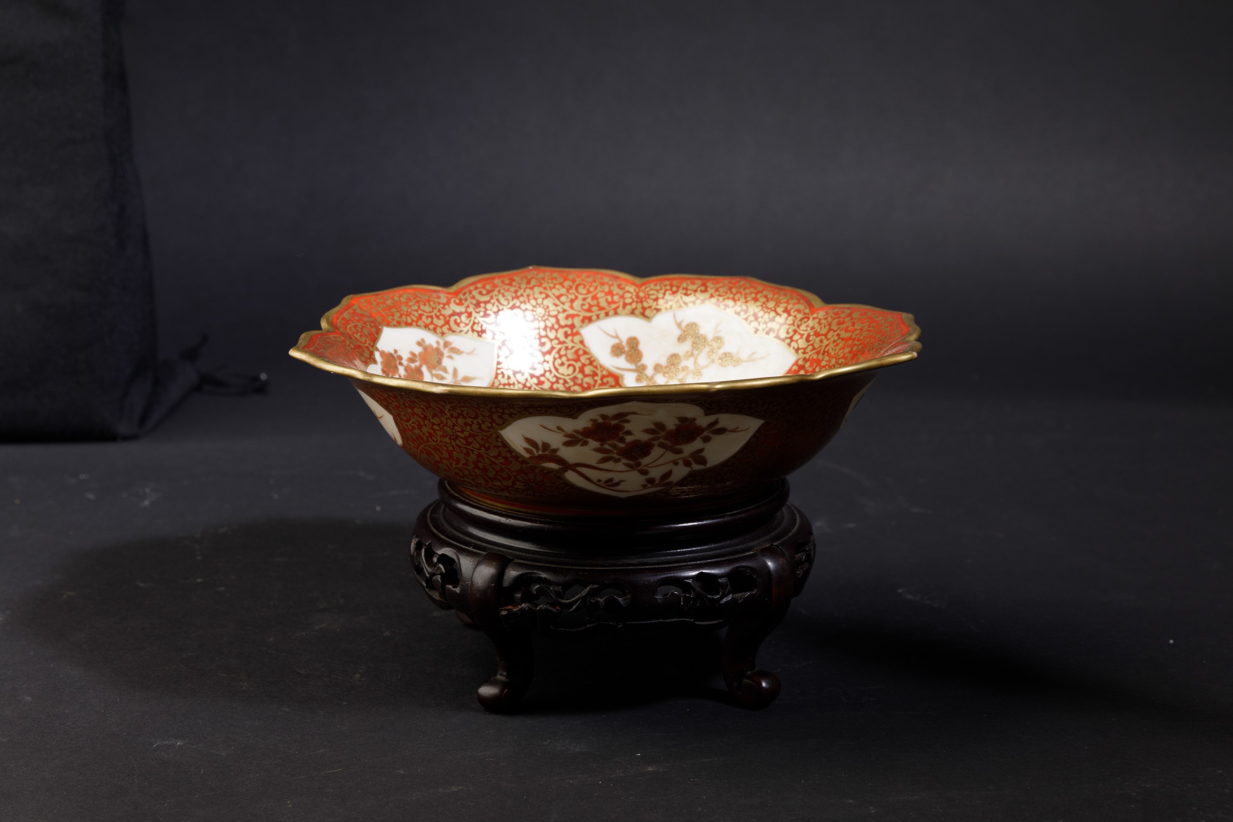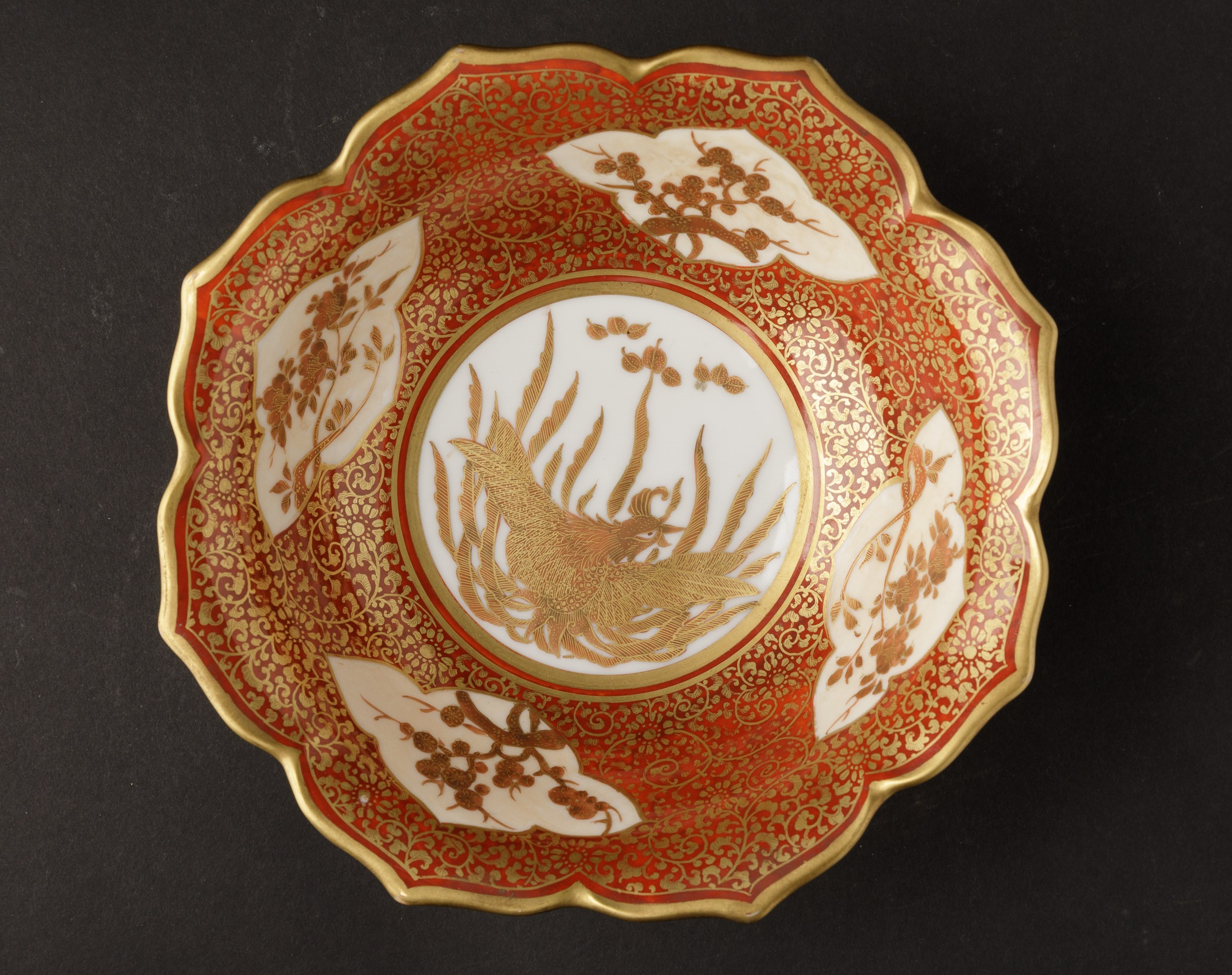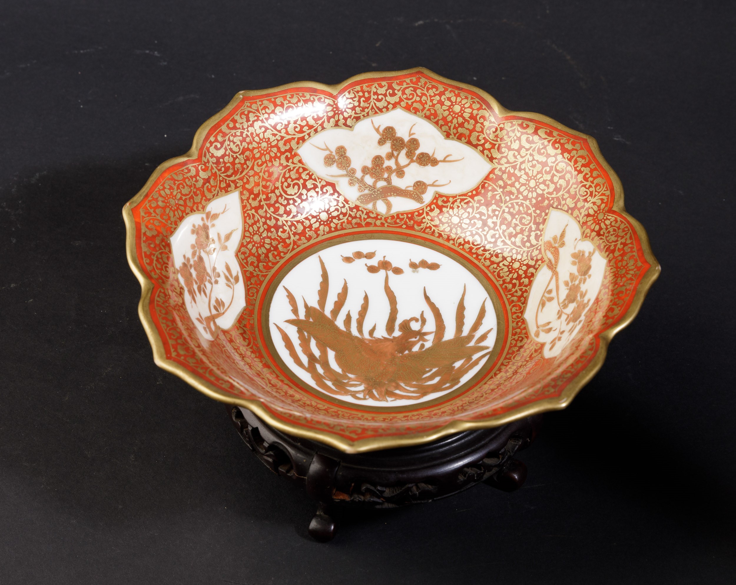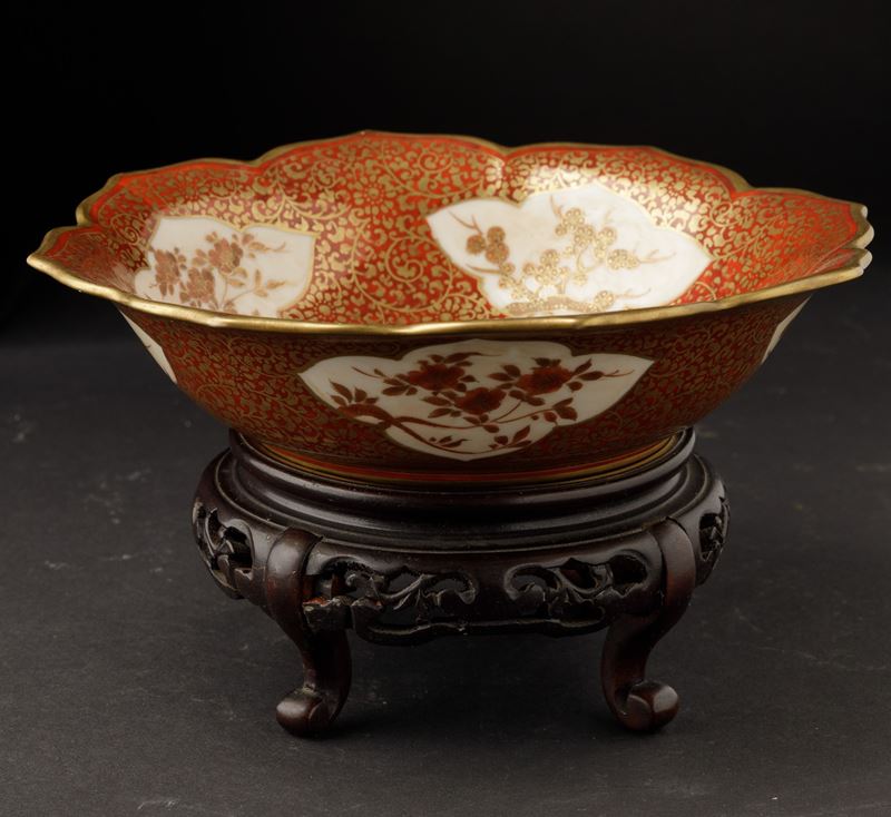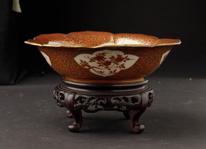 Ciotola sagomata in porcellana Kutani sui toni dell'arancio con scene naturalistiche entro riserve, Giappone, periodo Meiji [..]