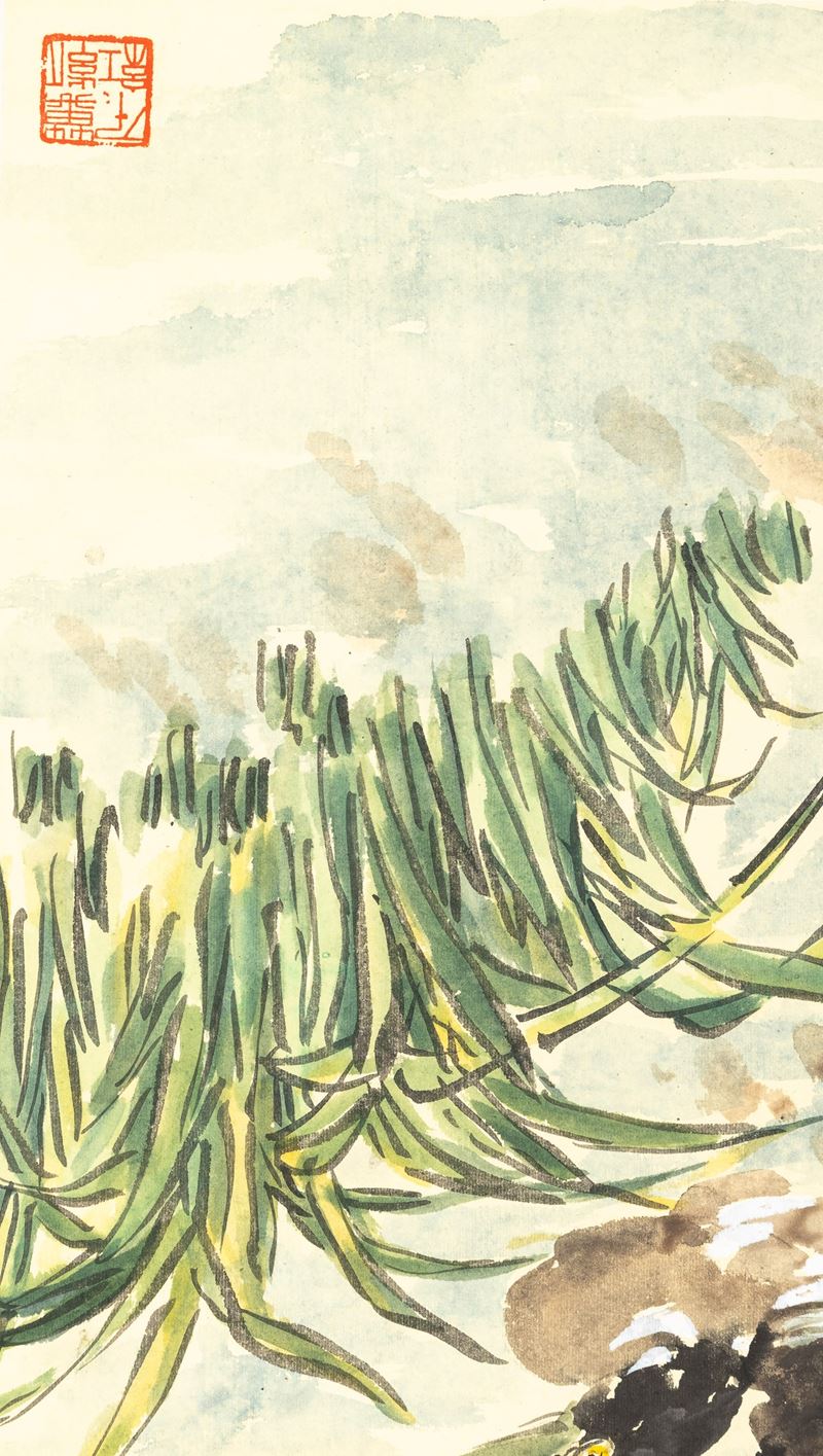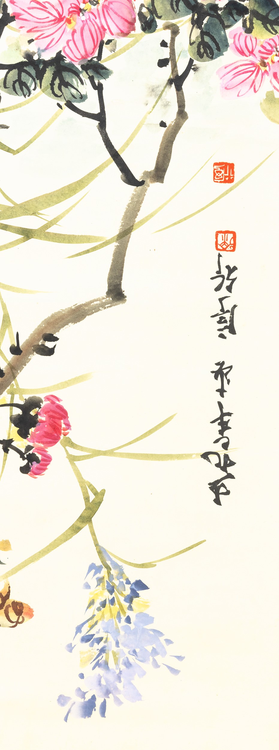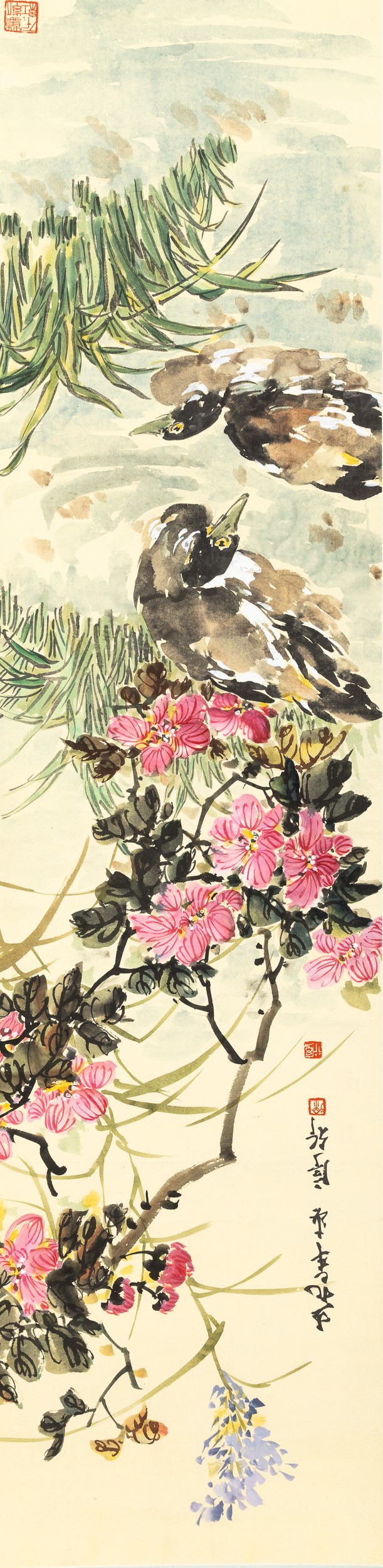 Dipinto su carta raffigurante papere nello stagno, rami in fiore e iscrizione, Cina, Dinastia Qing, XIX secolo