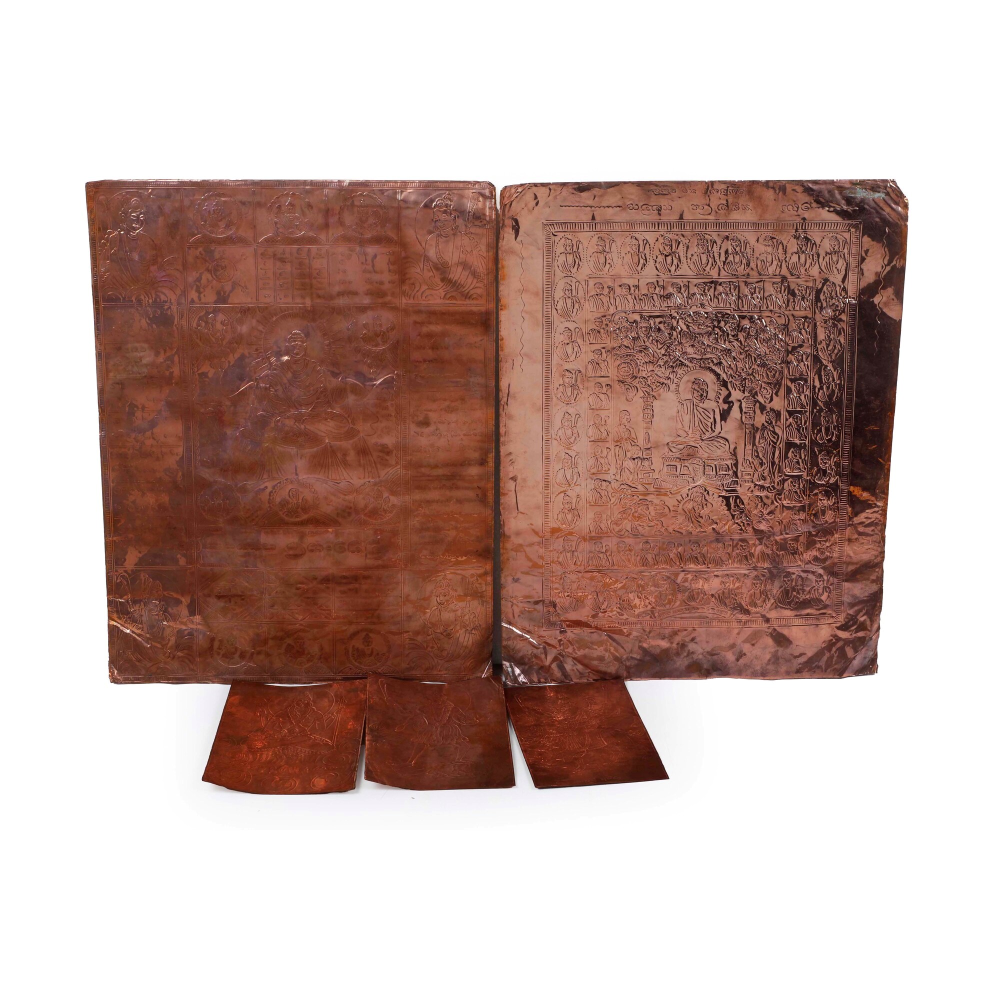 Lotto composto da cinque placche in metallo sbalzato con figure di divinità e iscrizioni, Thailandia, XX secolo