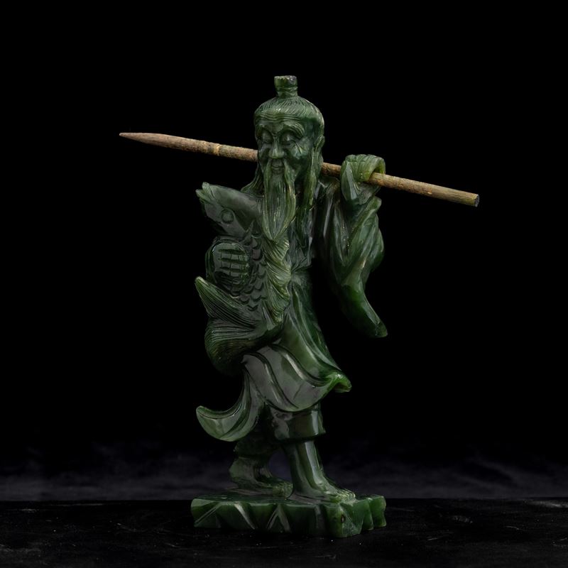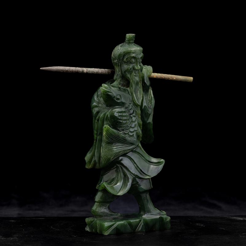 Scultura raffigurante pescatore in giada spinacio, Cina, XX secolo