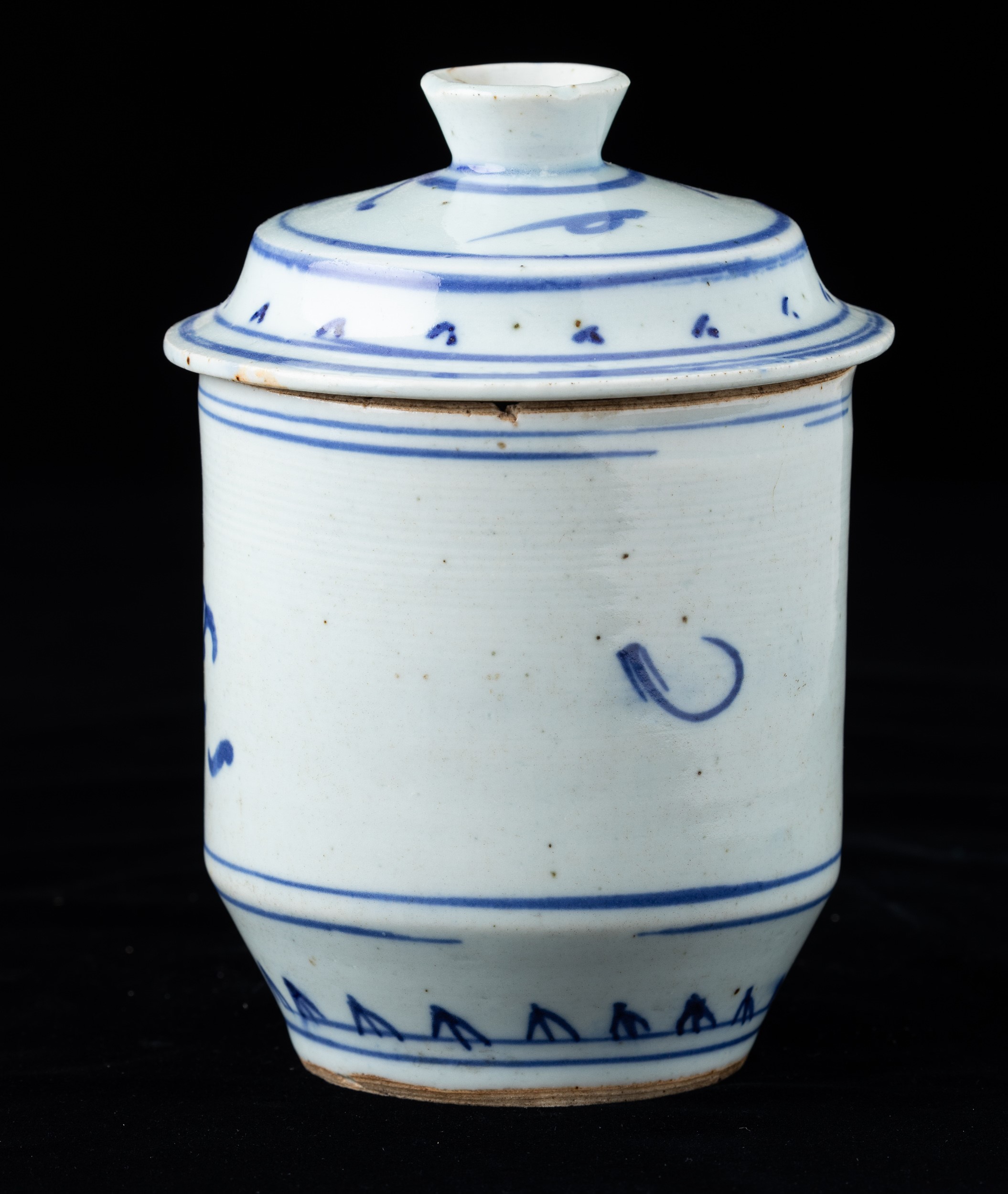 Vaso cilindrico con coperchio in porcellana bianca e blu con decoro naturalistico, Cina, Dinastia Qing, XIX secolo