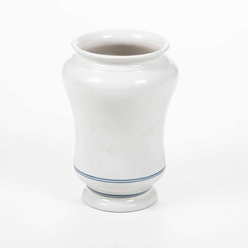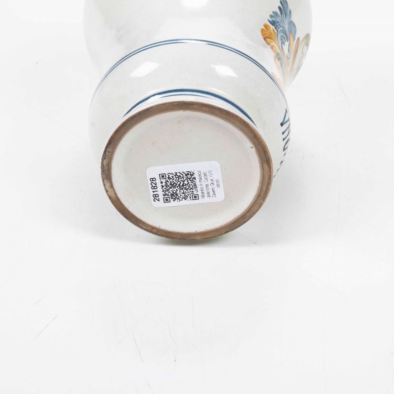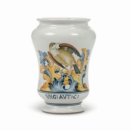 Albarello dall’alto piede, rastremato al centro e dal breve collo. Inferiormente vi è la scritta apotecaria in caratteri capitali "UNG:AUT:C:" sormontata da esuberanti rocaille su cui poggia un uccello. La decorazione policroma è eseguita con grande cura e maestria con ornati rococò e naturalistici che appartengono al nuovo repertorio che il Fuina ed il suo maestro Silvio de Martinis creano per rilanciare la maiolica castellana e rinnovarla dal tradizionale istoriato