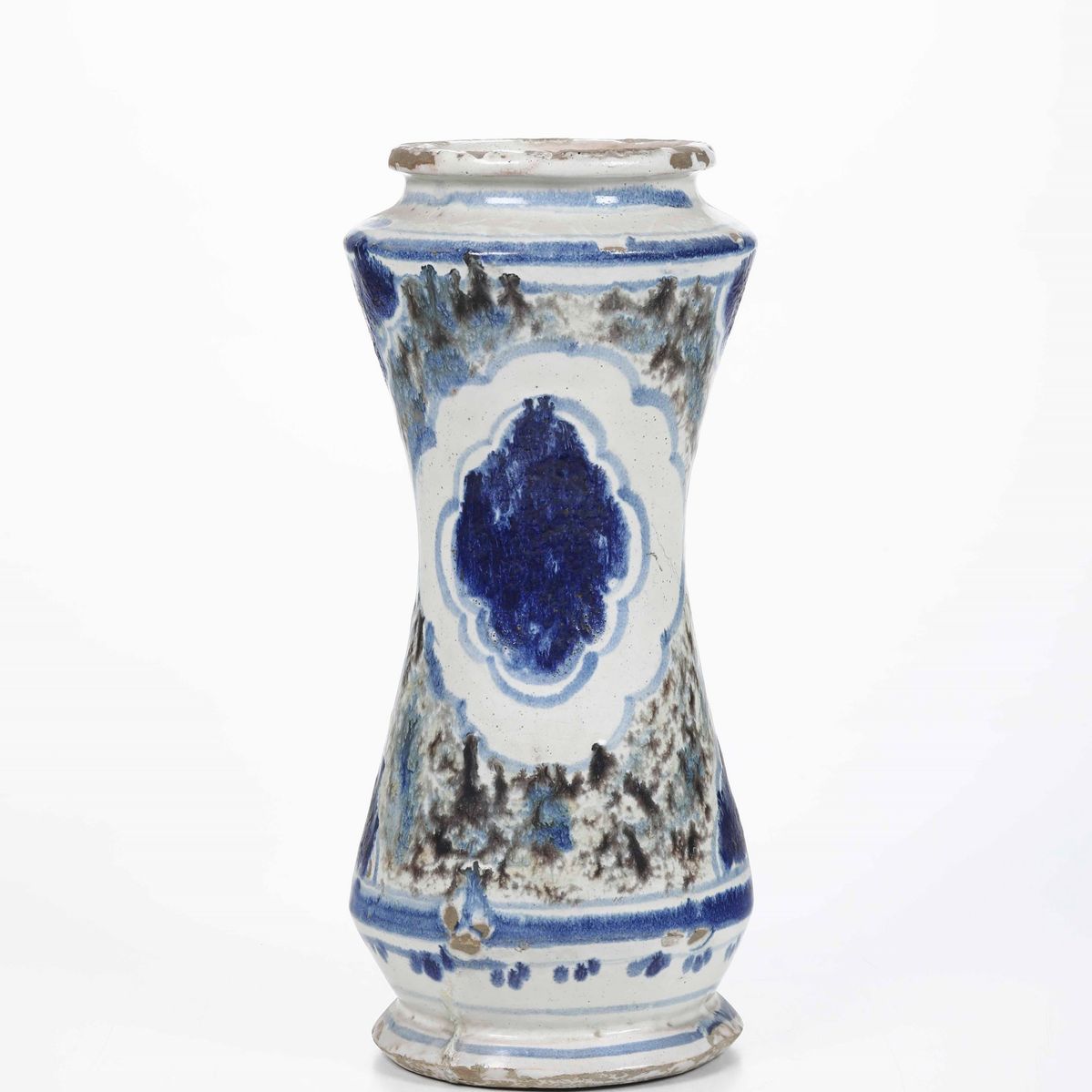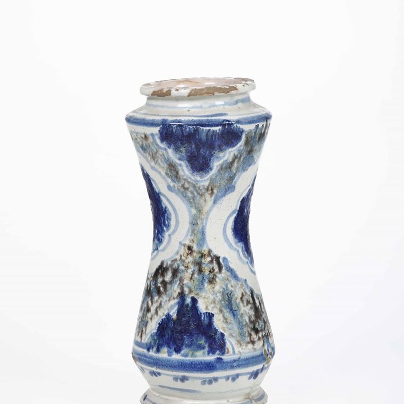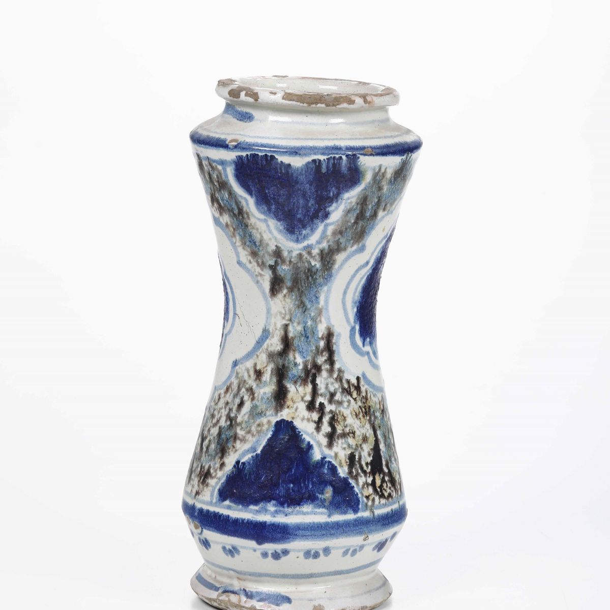 Albarello dalla forma cilindrica rastremata al centro, decorato con due medaglioni mistilinei campiti a macchie in blu. Il resto della superficie è marmorizzata in manganese colante e azzurro. Al piede serie di elementi tripuntiformi azzurri