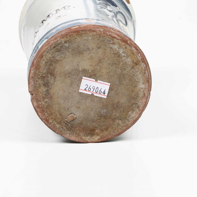 Albarello dalla forma slanciata, leggermente rastremata al centro, decorato con uno stemma araldico sormontato da un’aquila nei colori blu giallo, ocra e manganese. Porta le scritte e la data "DAM MP 1793"