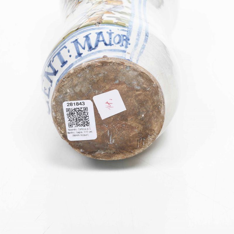L’albarello fa parte del corredo della spezieria della Certosa di San Martino a Napoli. Sul recto è raffigurato in policromia a gran fuoco San Martino a cavallo che dona parte del suo mantello allo storpio, sul verso il monogramma certosino "CRT" sormontato dalla croce e dalla corona, inoltre la data "1700"