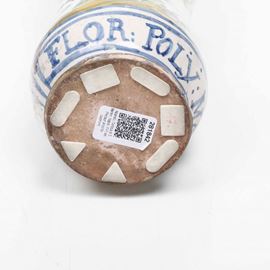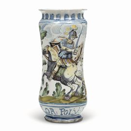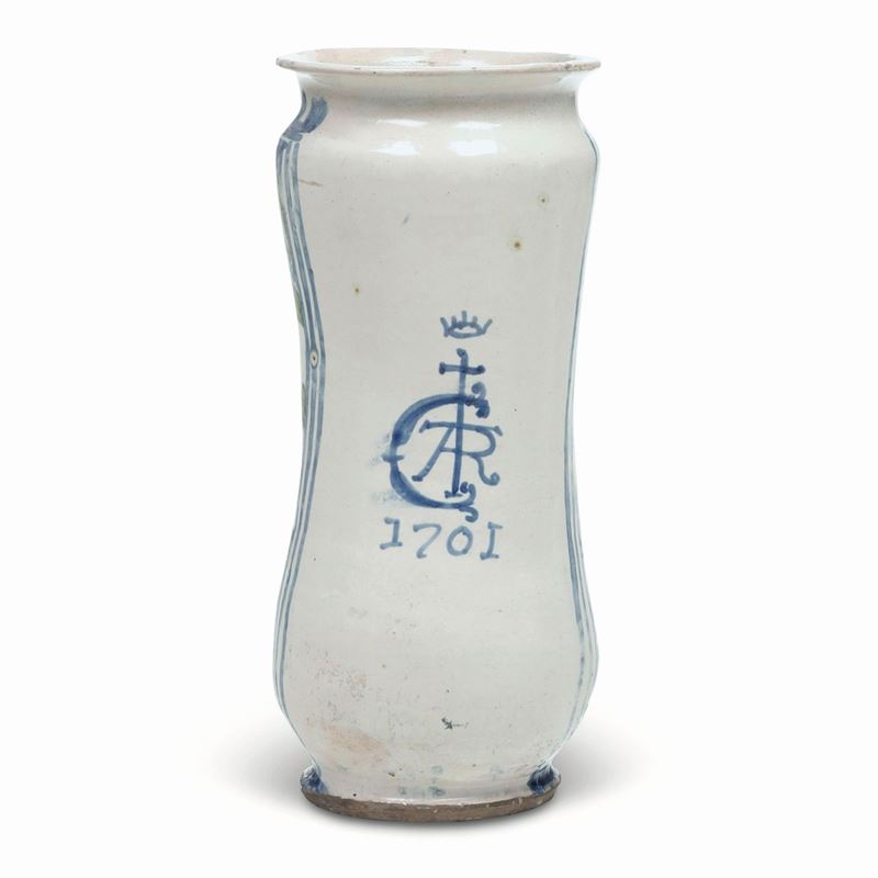 Per due albarelli simili vedi ad esempio G.C.Bojani - C.Ravanelli Guidotti - A.Fanfani, La donazione Galeazzo Cora, Ceramiche dal Medioevo al XIX secolo, Milano 1985, n. 53. Altri esemplari sono conservati alla Certosa di San Martino, oggi divenuto museo (T.Fittipaldi, Museo di San Martino. Ceramiche. Castelli, Napoli, altre fabbriche, Napoli 1992, I, pp. 237-241) e in diverse collezioni pubbliche e private sia in Italia che all’estero