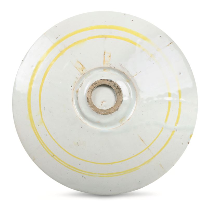 Maiolica policroma a gran fuoco. Marca: assente Diametro: cm 28,6. Conservazione: buona; mancante del piede; qualche sbeccatura e usura al bordo