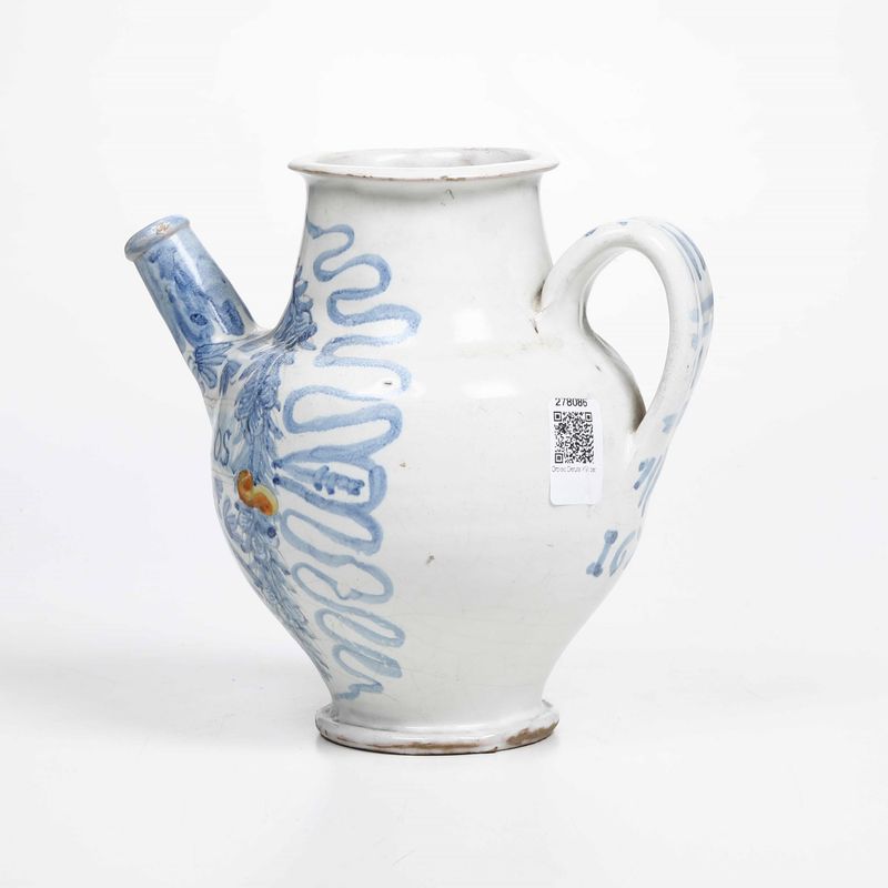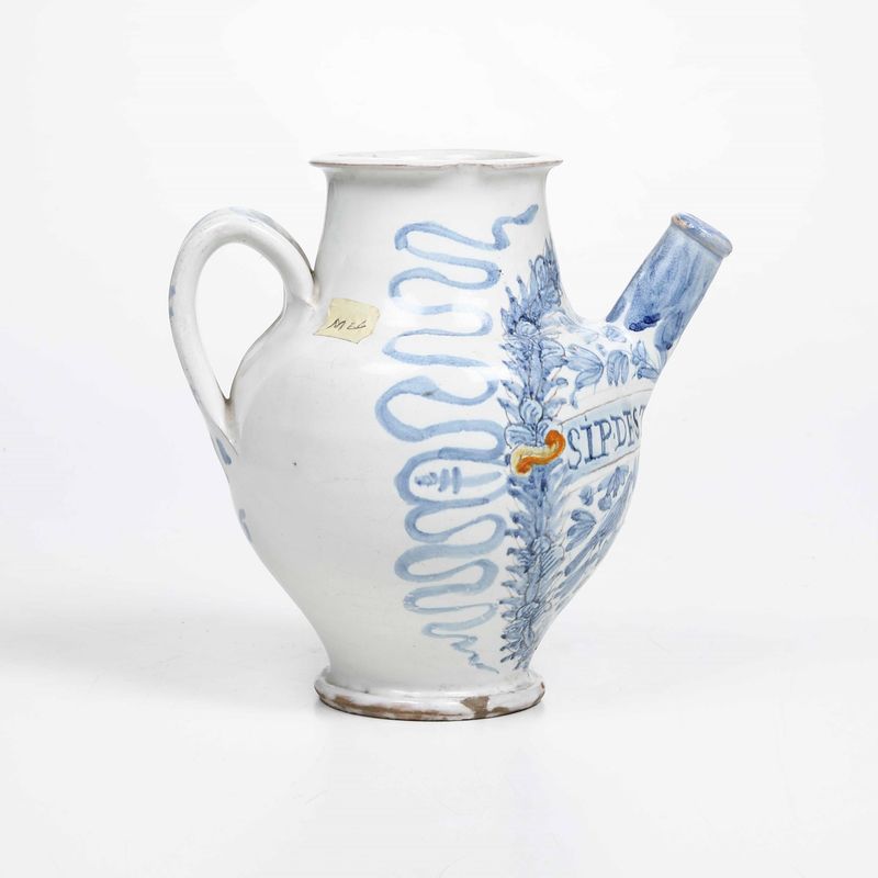 Brocca da farmacia, a corpo ovoidale, versatore cilindrico e manico a nastro. La decorazione si compone frontalmente di un largo medaglione circolare, delimitato da un festone di foglie; all’interno del medaglione è dipinto un cartiglio orizzontale su cui è tracciata la scritta farmaceutica "SIP. DE. STICADOS", ovvero sciroppo di sticados, rimedio di origine medievale contro le infezioni; al centro del medaglione, sotto il cartiglio, è presente uno stemma
