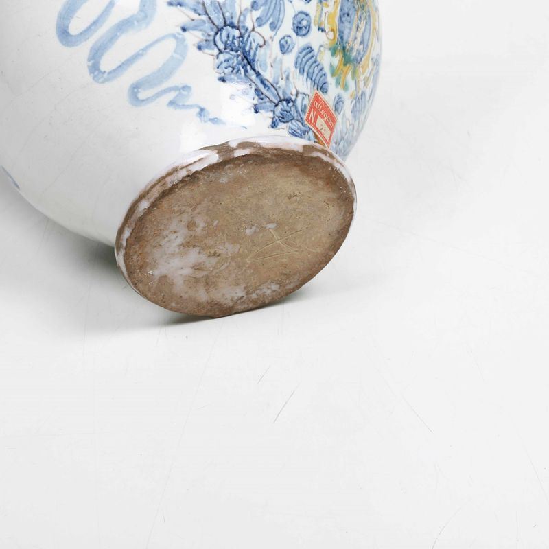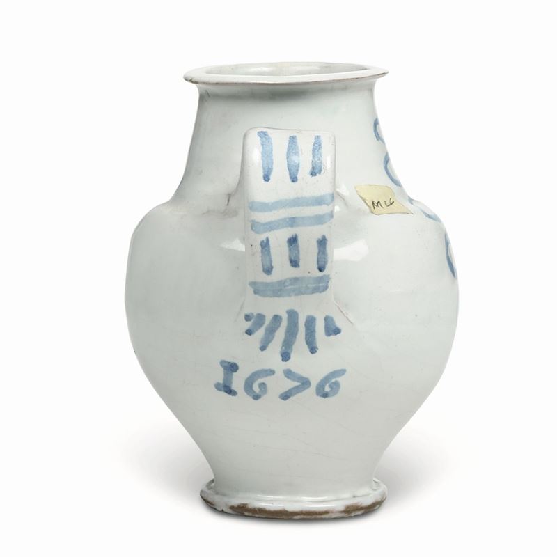 Vaso da farmacia interessante per la presenza della data "1676", che sancisce sia l’esecuzione del corredo a cui apparteneva sia la fortuna dello "stile calligrafico- naturalistico", di gusto orientaleggiante, che nel repertorio di Deruta rappresentò uno dei motivi di maggiore fortuna ed estensione produttiva del ‘600