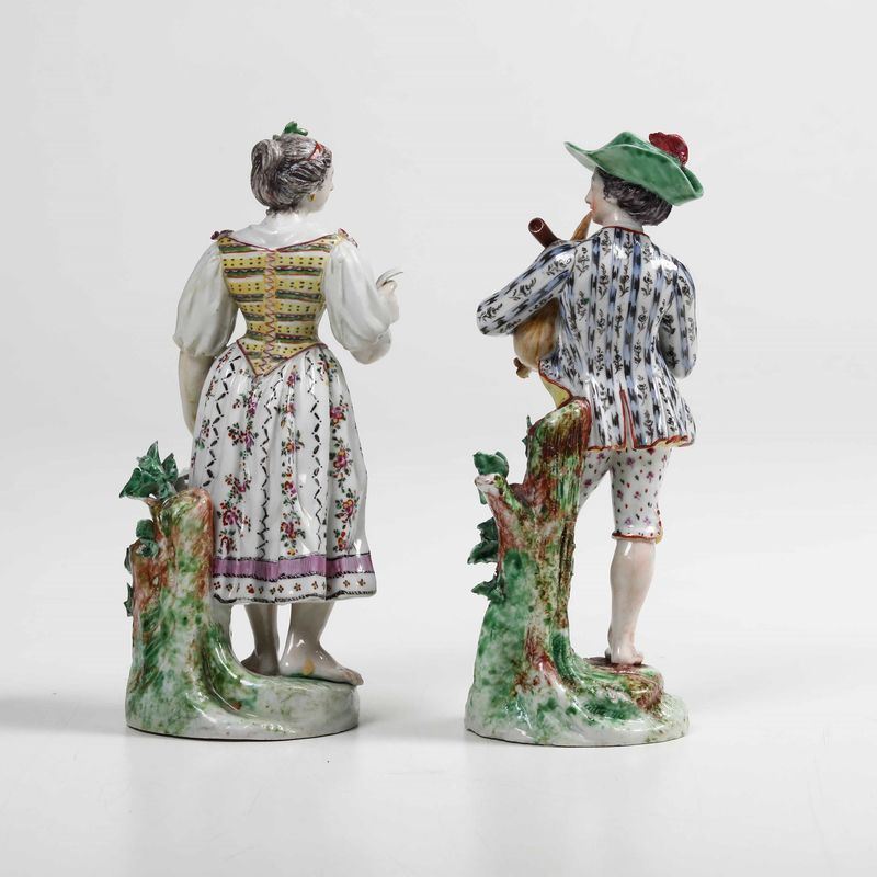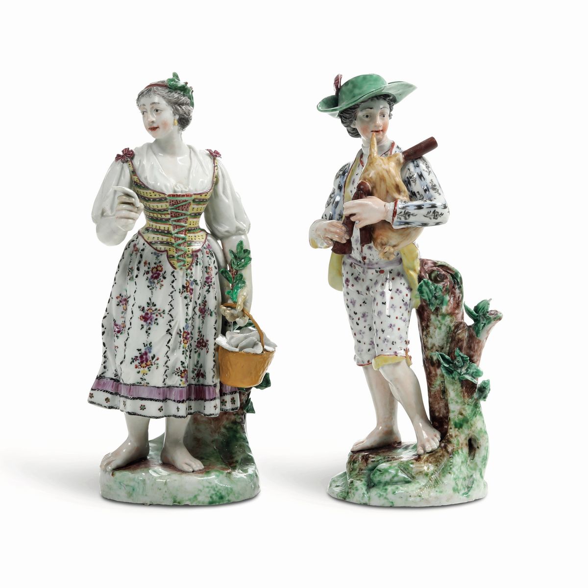 Queste figure, di notevoli dimensioni, raffigurano una venditrice di fazzoletti e uno zampognaro, probabilmente le uniche di questa altezza che normalmente misurano cm 13-14 circa. Mentre se ne conoscono in porcellana bianca, non siamo a conoscenza di altre decorate in policromia. Come di consueto lo stampo per modellare