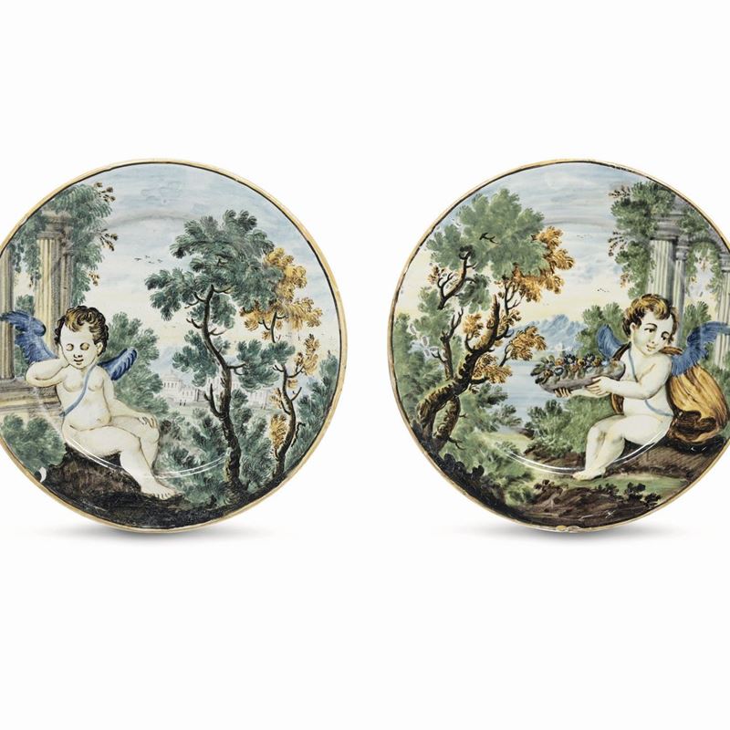 Questi piattini sono dipinti con colori a gran fuoco, ognuno con un putto alato seduto a terra in un paesaggio con rovine, alberi frondosi ed edifici sullo sfondo