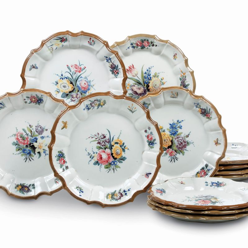 Piatti rotondi con orlo mistilineo e tesa bacellata ripresi dal modello settecentesco tipico della manifattura novese con il bordo listato in color canna. Il centro ospita la decorazione pittorica con fiori naturalistici che sembrano appena raccolti dai prati e che variano continuamente nelle composizioni con virtuosismo ed equilibrio cromatico