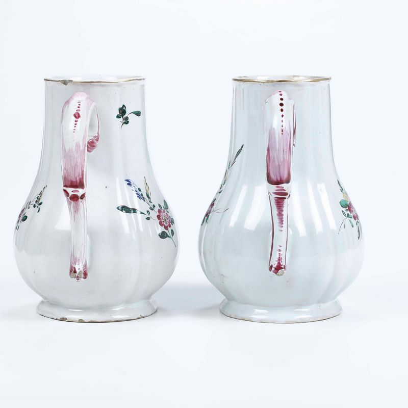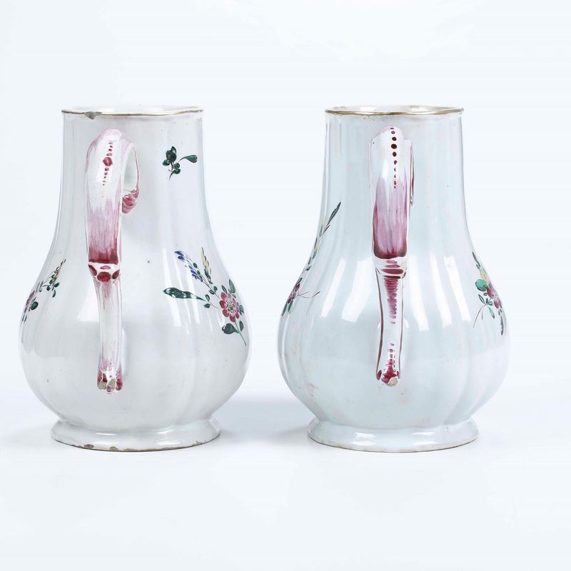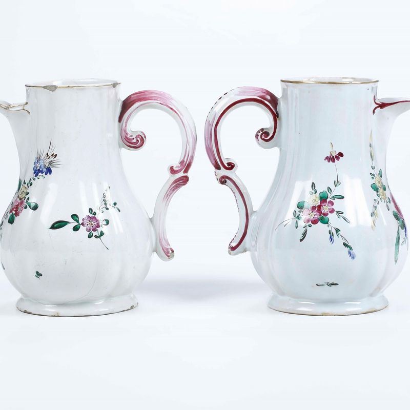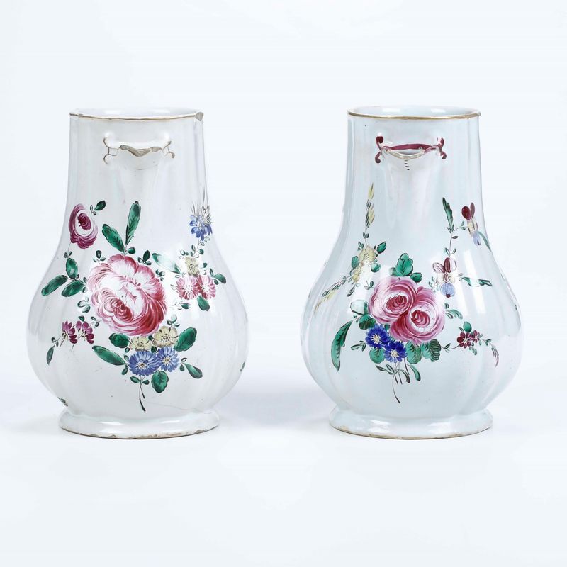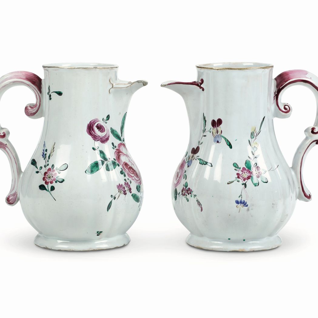 Due caffettiere in maiolica fina, dal corpo ovoidale costolato con alto collo, versatoio a becco e ansa a doppia voluta, modellato a stampo, sono decorate con un ornato a mazzetti di fiori recisi, in stile naturalistico, dominati da rose, con violette e speronelle. Gli orli sono profilati in oro
