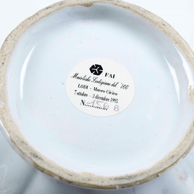 Maiolica decorata con colori a piccolo fuoco. Marca: assente; etichette cartacee con "FAI Maioliche lodigiane del ‘700 Lodi - Museo Civico 7 ottobre - 3 dicembre 1995 N. 156 A" e rispettivamente "N. 156 B"