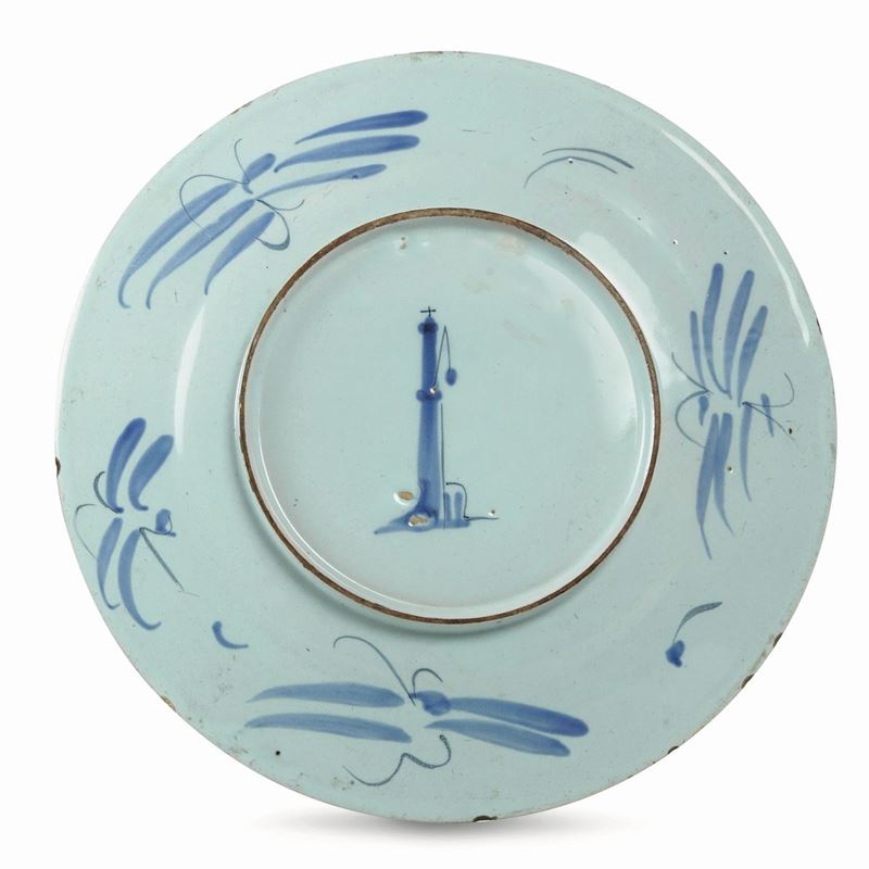 Piatto tondo a larga tesa dall’orlo liscio decorato "a tappezzeria" in monocromia in blu di cobalto su fondo azzurrino con al centro soggetto mitologico con due personaggi in ampio paesaggio con edificio. Bulbi floreali all’orientale, piccoli tralci fogliati e insetti in volo completano il paesaggio fantastico. Sul verso foglie stilizzate