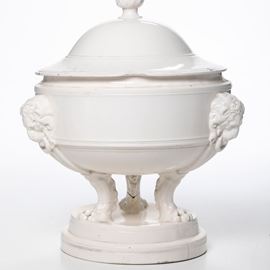La grande zuppiera, con l’alto coperchio bombato e presa a forma di pigna, poggia su tre zampe leonine che la raccordano alla base circolare a plinto Le anse sono modellate a testa di leone