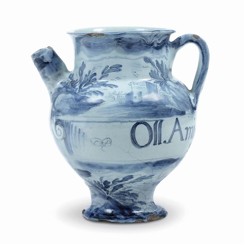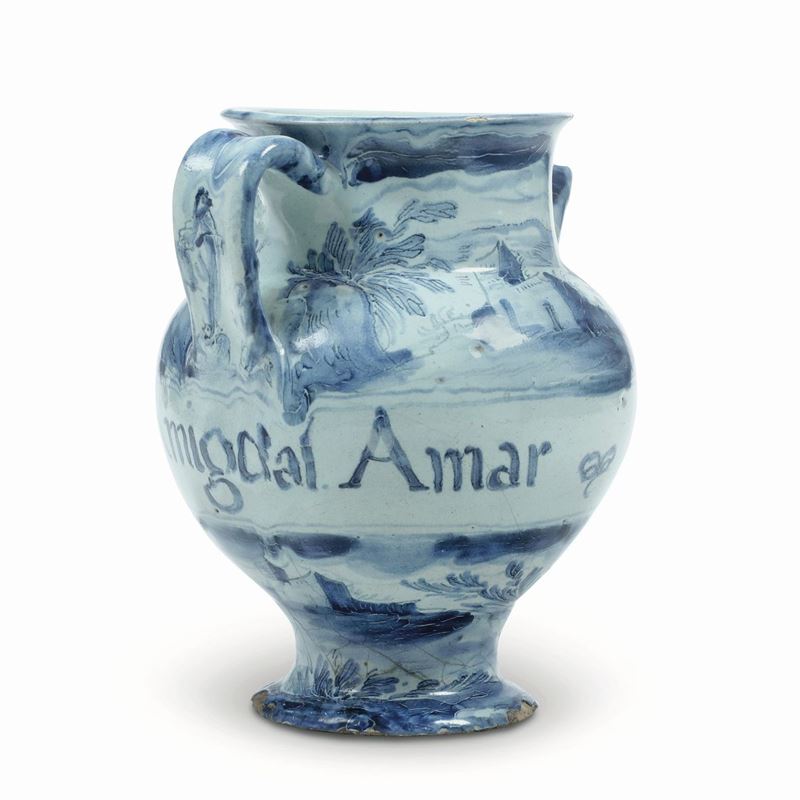l’iscrizione "Oll. Amigdal. Amar." L’orciolo forse apparteneva dalla Farmacia dell’ospedale al Santuario della Misericordia (C.Chilosi, scheda, in Ceramiche della tradizione Ligure. Theasurus delle opere dal MedioEvo al primo Novecento, Milano 2011, pp. 204, n. 246)
