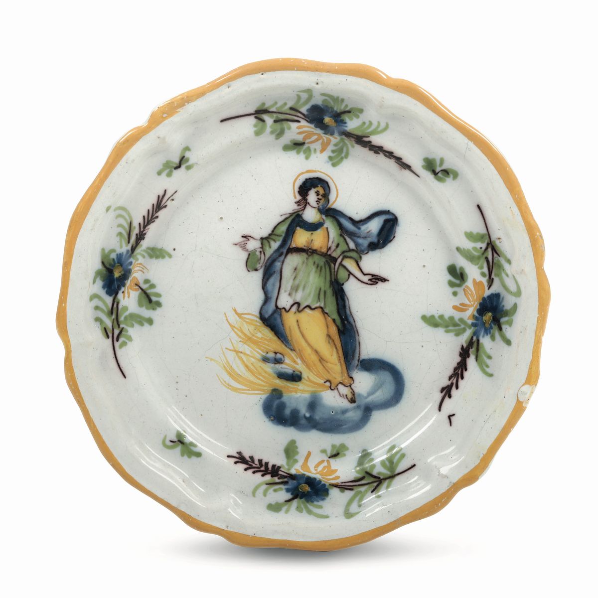 Il piatto dal bordo mistilineo profilato in giallo è stato eseguito in una fabbrica popolare lodigiana. Decorato in policromia ospita al centro la Madonna su una piccola nube con fuoco e sulla tesa steli fogliati con un fiore giallo e uno blu