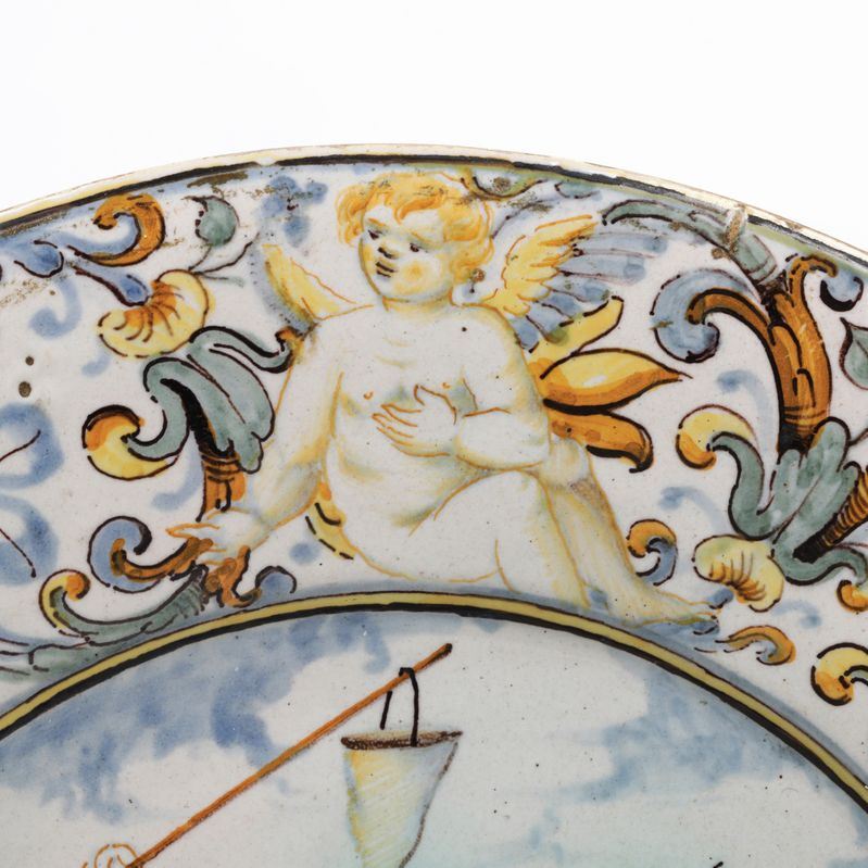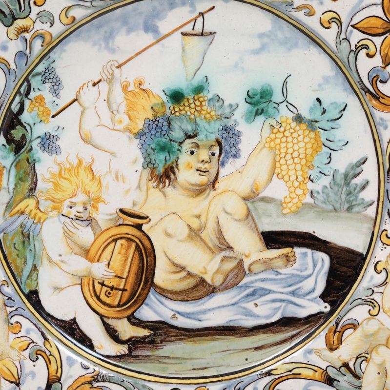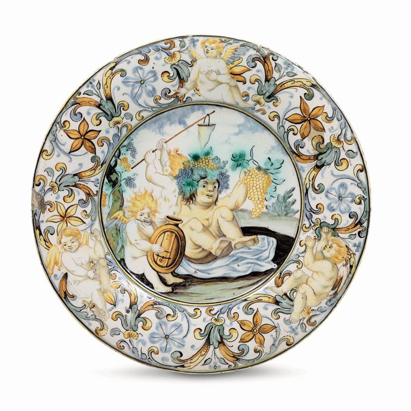 Il piatto raffigura Bacco bambino con in mano e sul capo grappoli d’uva con pampini, accompagnato da due putti. Sulla tesa girali con fiori e tre putti alati