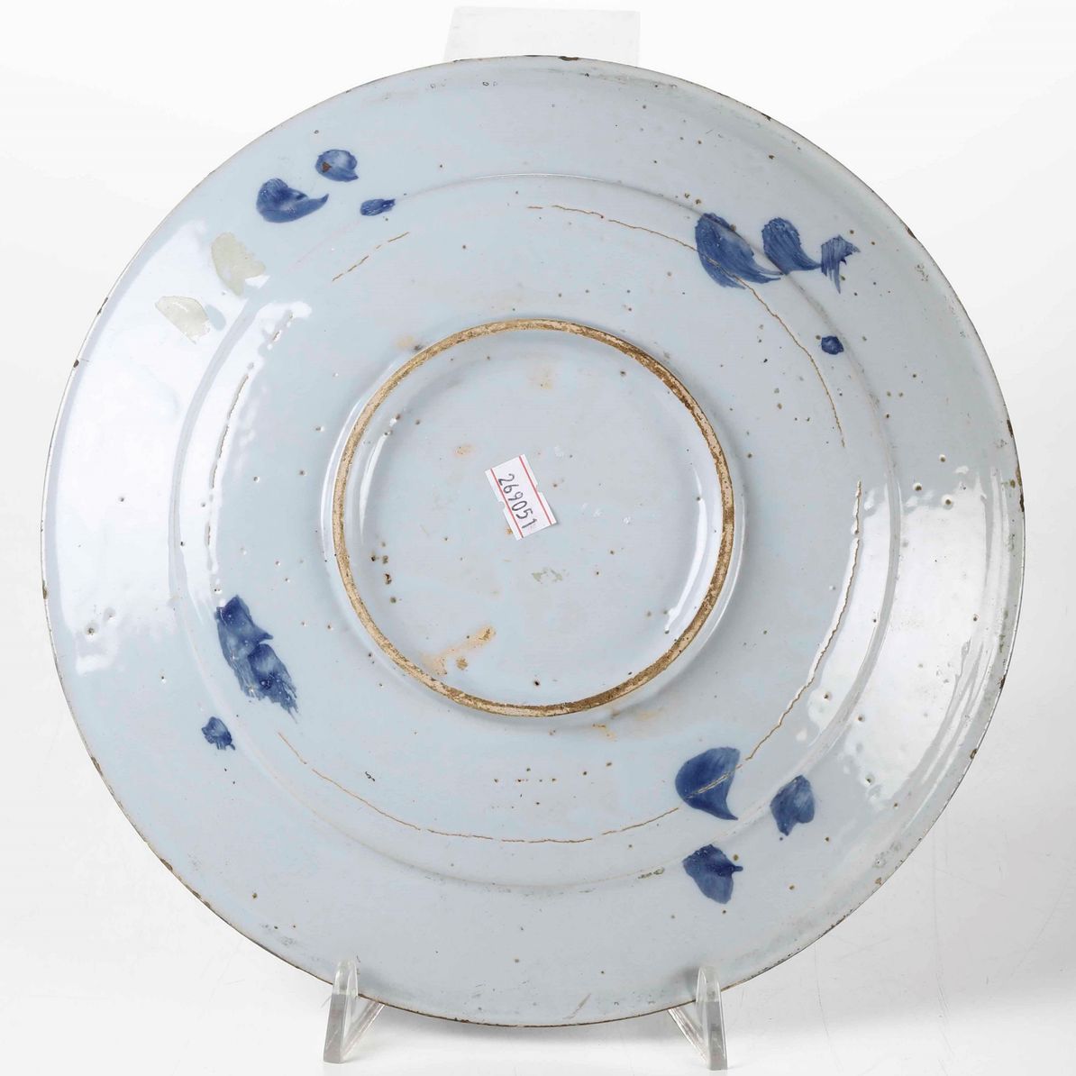Piatto tondo, dallo smalto leggermente azzurrato, con figura di giovane che suona la tromba tra ciuffi fogliati dipinta in monocromia blu. Qualche tocco di pennello sul retro