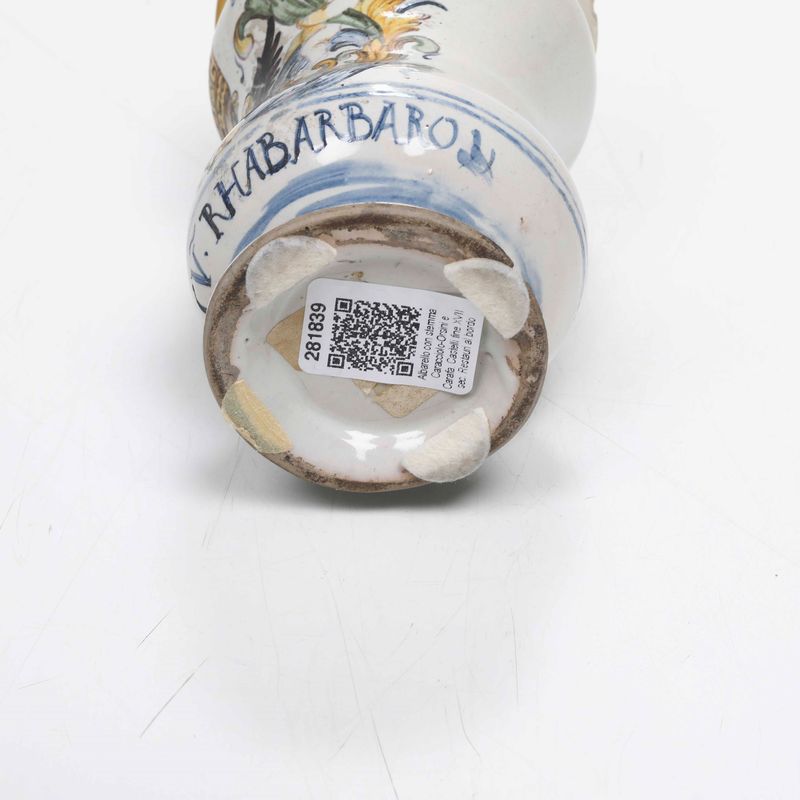 Per altri vasi apotecari provenienti dallo stesso insieme vedi ad esempio G.BISCONTINI UGOLINI, I vasi da farmacia nella collezione Bayer, Ospedaletto (Pisa) 1997, n. 49; AA.VV., Capolavori della Maiolica Castellana dal Cinquecento al Terzo Fuoco, La Collezione Matricardi, Torino 2012,