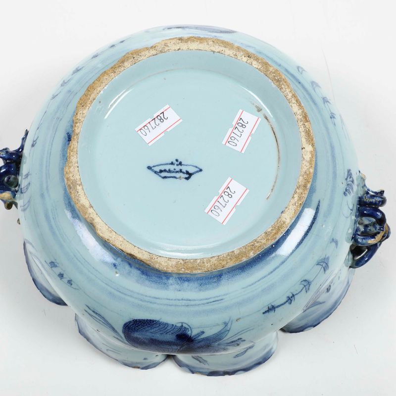 Il bacile presenta all’orlo superiore otto lobi e due prese formate da colombini intrecciati. La decorazione in blu su fondo azzurrino vede sul fondo un putto con drappo attorniato da grandi elementi vegetali a tappezzeria che si ripetono anche sulla parete esterna