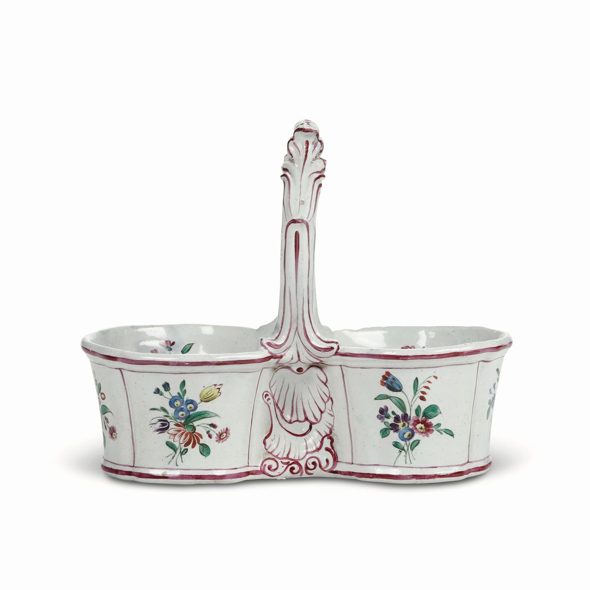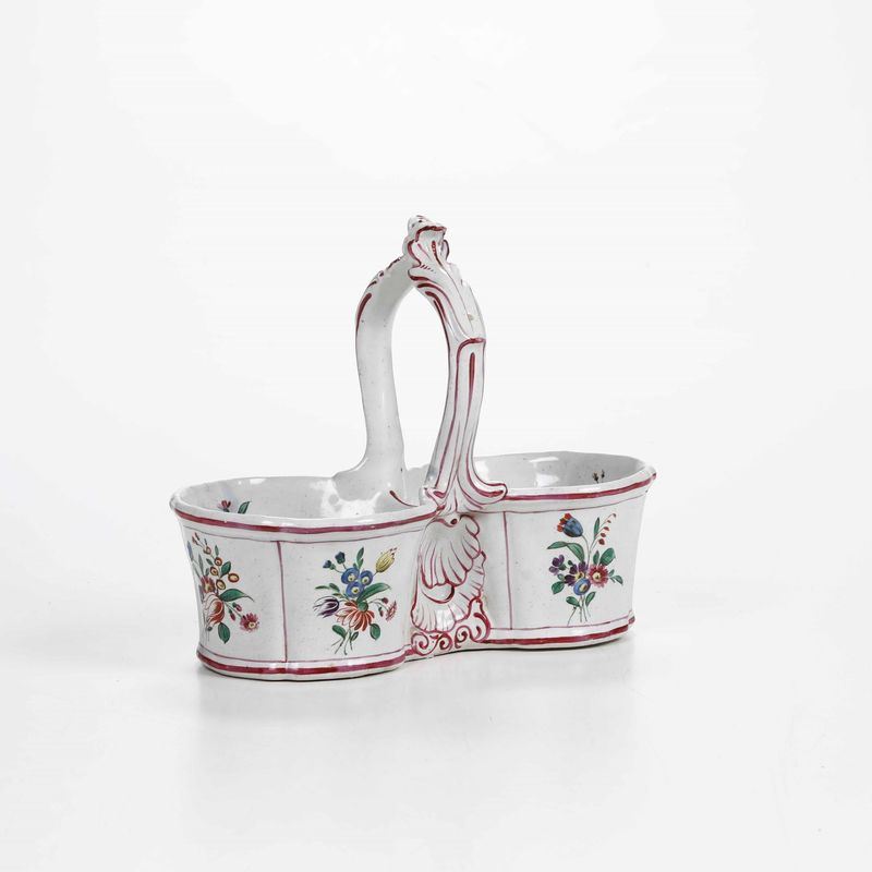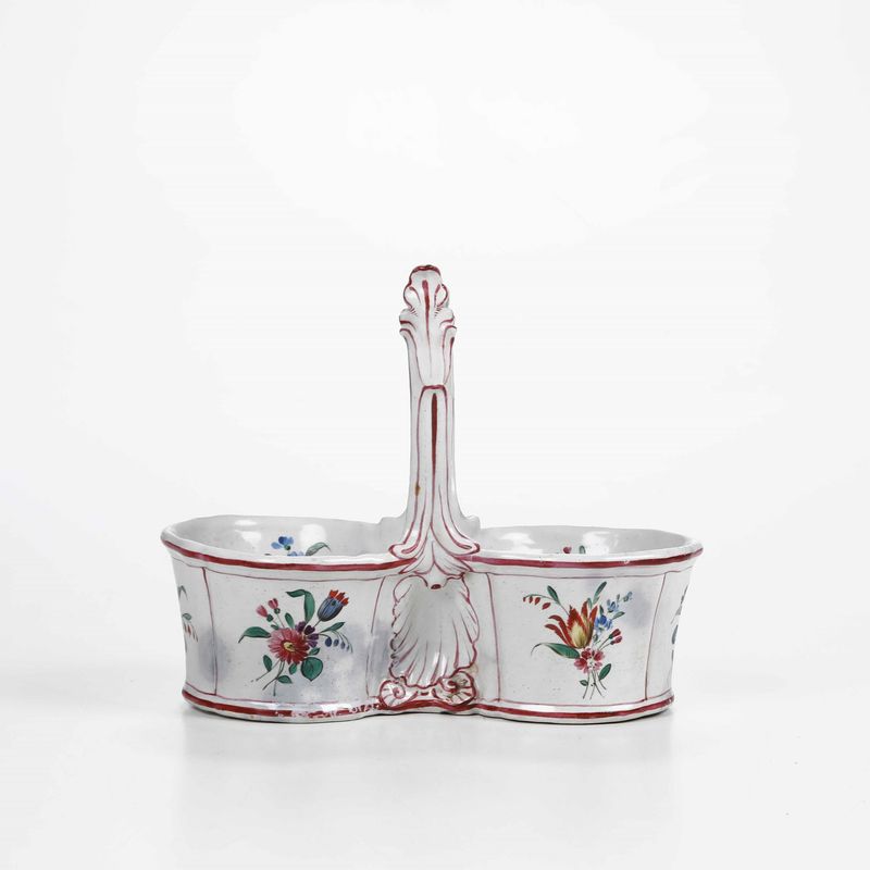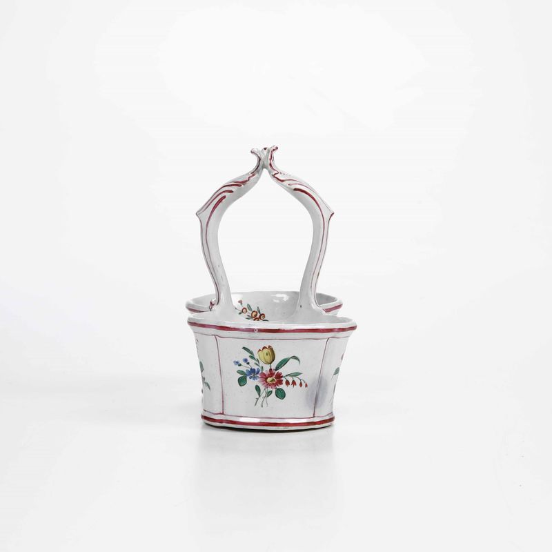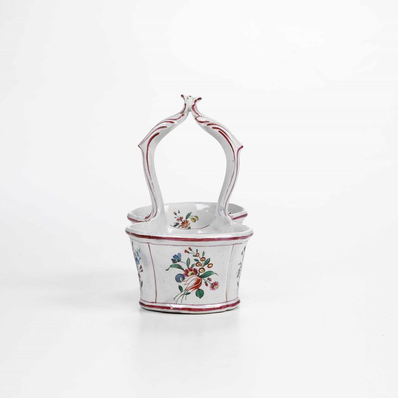 Le pareti presentano scanalature verticali e il manico, modellato a rocailles di gusto rococò, sono lumeggiati in rosso porpora. La decorazione pittorica è a mazzetti di fiori policromi