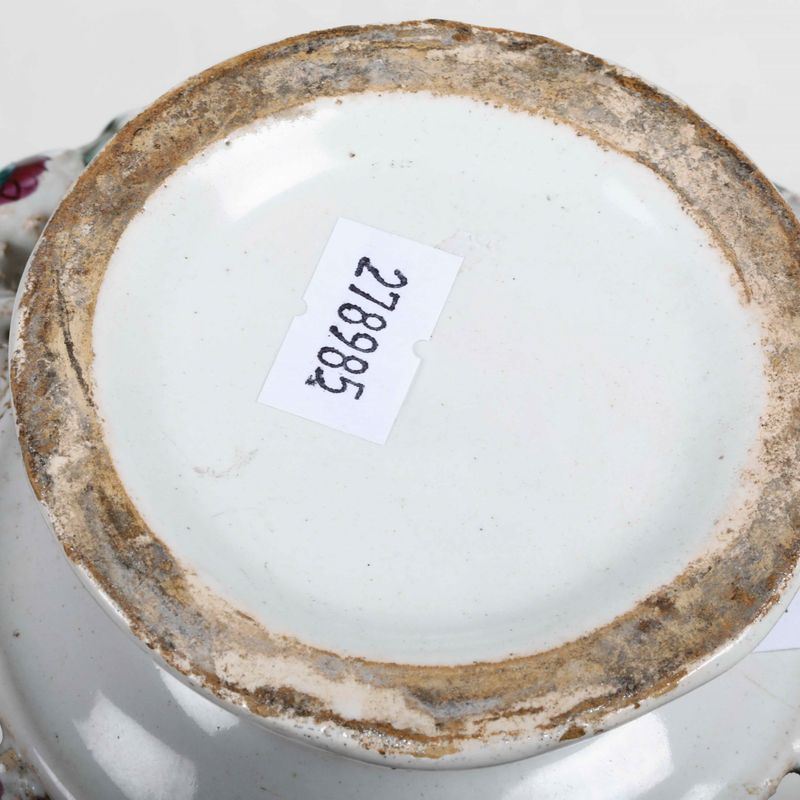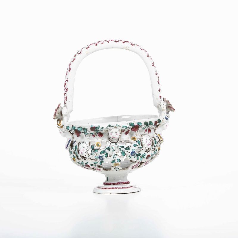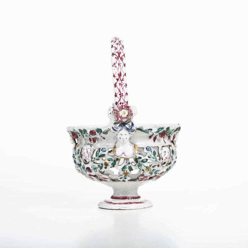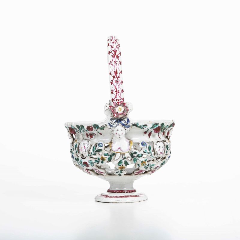 Maiolica decorata con colori a piccolo fuoco. Marca: assente Dimensioni: altezza cm 29,2. Conservazione: trascurabile rottura al bordo interno; insignificanti felature e mancanze ai petali dei fiori