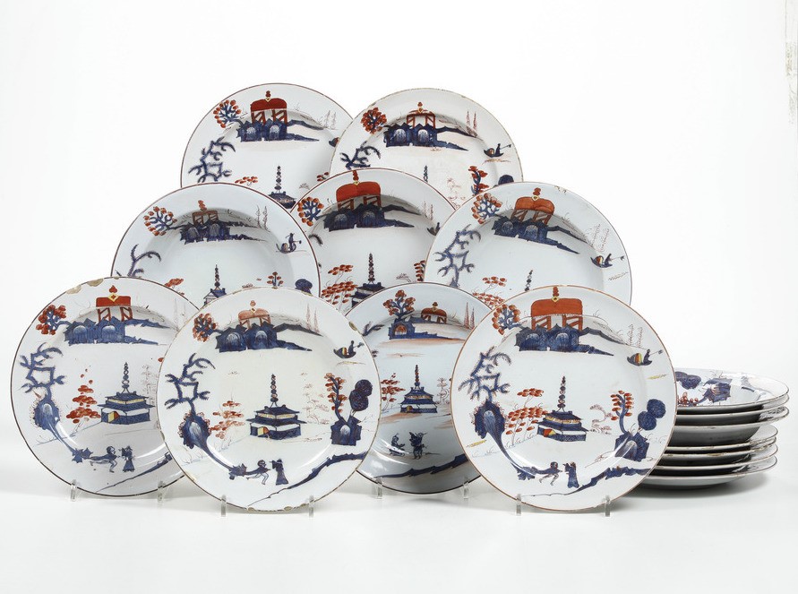 I 6 piatti fondi e i 10 piani, dal bordo liscio, sono decorati con il motivo "alla pagoda" o "al casotto", più comunemente conosciuto come quello "al carabiniere", in tricromia Imari con blu, rosso e giallo. Motivo che vede un olandese che si inginocchia davanti ad un sacerdote orientale davanti ad una pagoda. Questo motivo è stato prodotto dalle due manifatture milanesi del Settecento