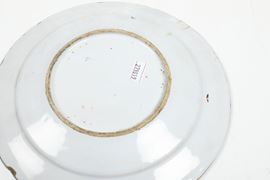 Diametro: cm 22,8 circa. Conservazione: buona; tre piatti fondi e due piani con sbeccature al bordo; piccole usure e cadute di smalto ai bordi
