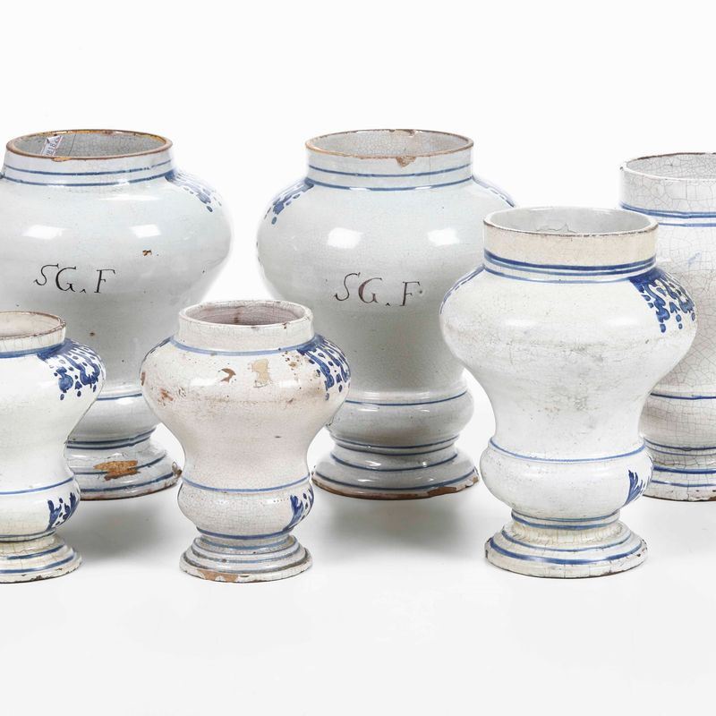 Sei vasi da farmacia dalla forma a balaustro in maiolica decorata su un lato, con motivi ornamentali rococò in monocromia blu su spalla e calice e un cartiglio giallo a volute. Sul retro si legge la marca "SG.F"