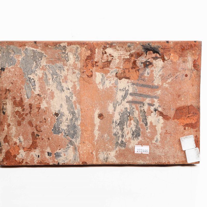 a gran fuoco. La cornice modanata bruna, spugnata in manganese, inquadra una scena all’antica, forse biblica, che vede sulla destra, un uomo anziano, barbuto, seduto sotto una pergola, con rami fruttiferi rampicanti. Anche un albero dal fusto sinuoso, filtra lo sfondo paesaggistico che vede, a sinistra, un borgo turrito animato da figurette