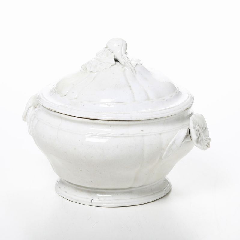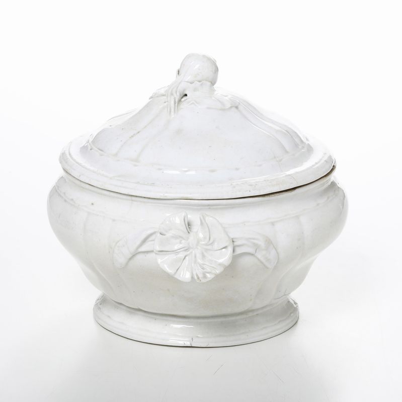 Zuppiera rotonda dalla parete bombata con bacellature verticali e manici formati da due nastri che terminano con un fiocco Il coperchio presenta la presa modellata a forma di cipolla con foglie
