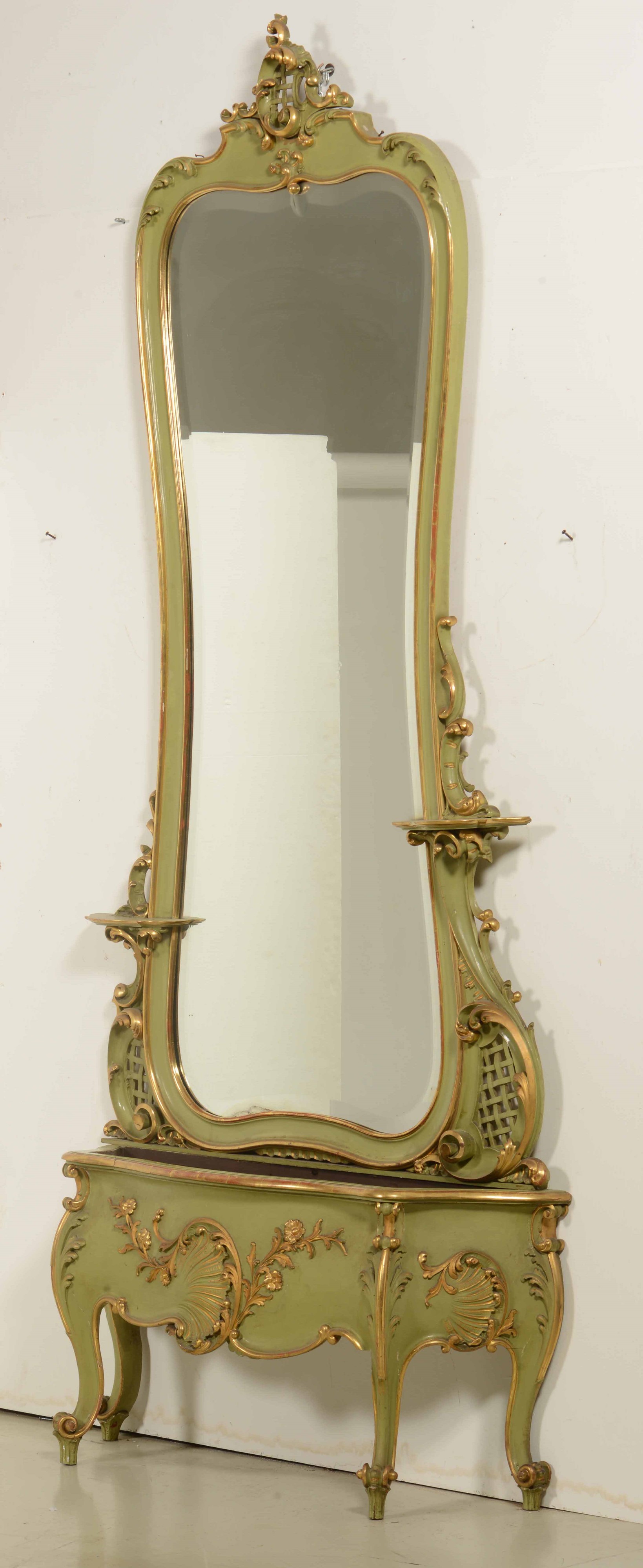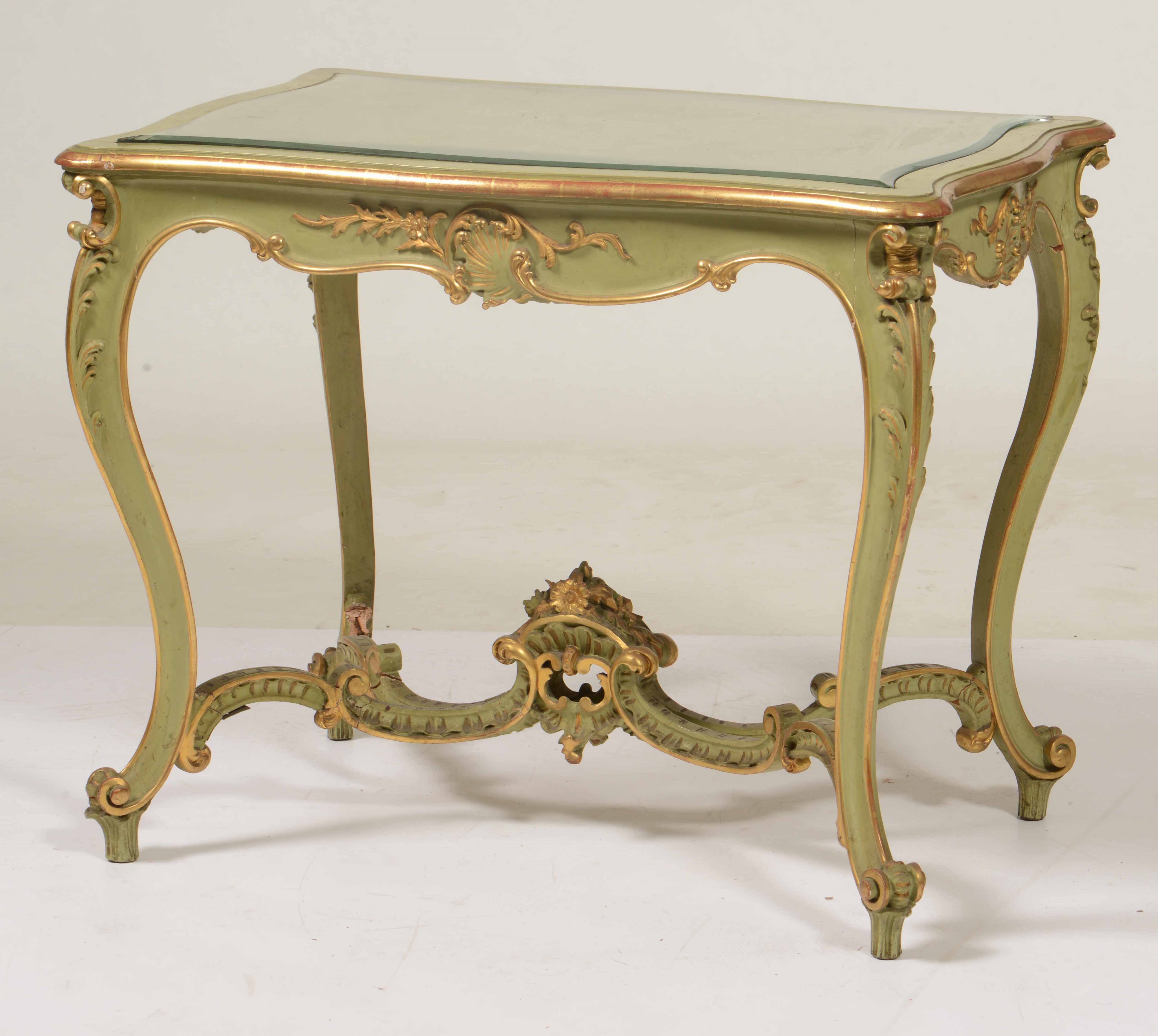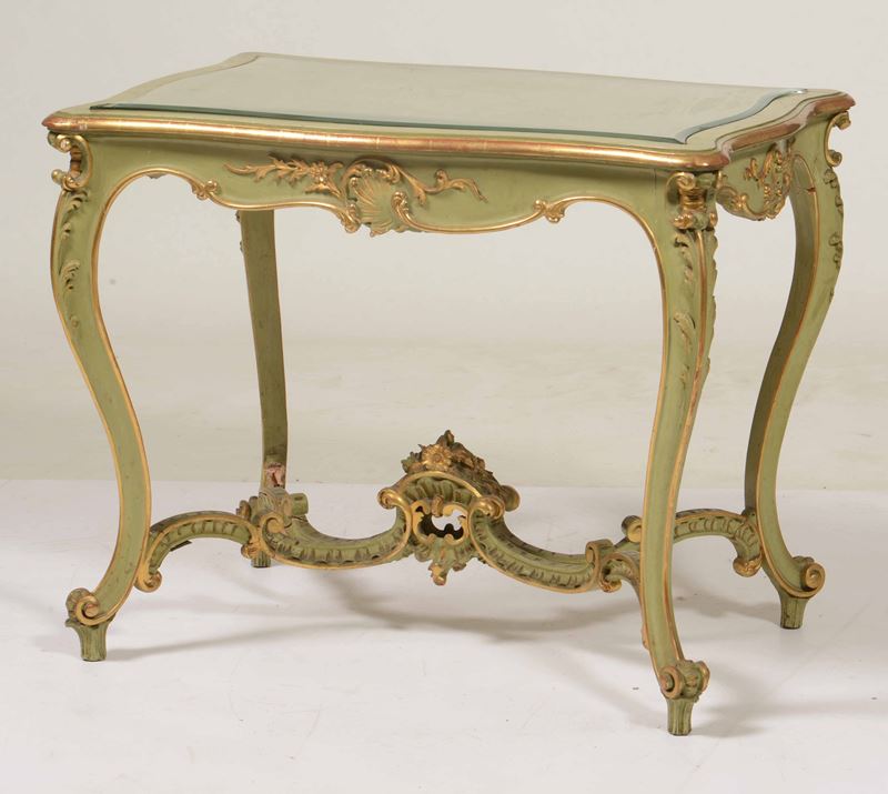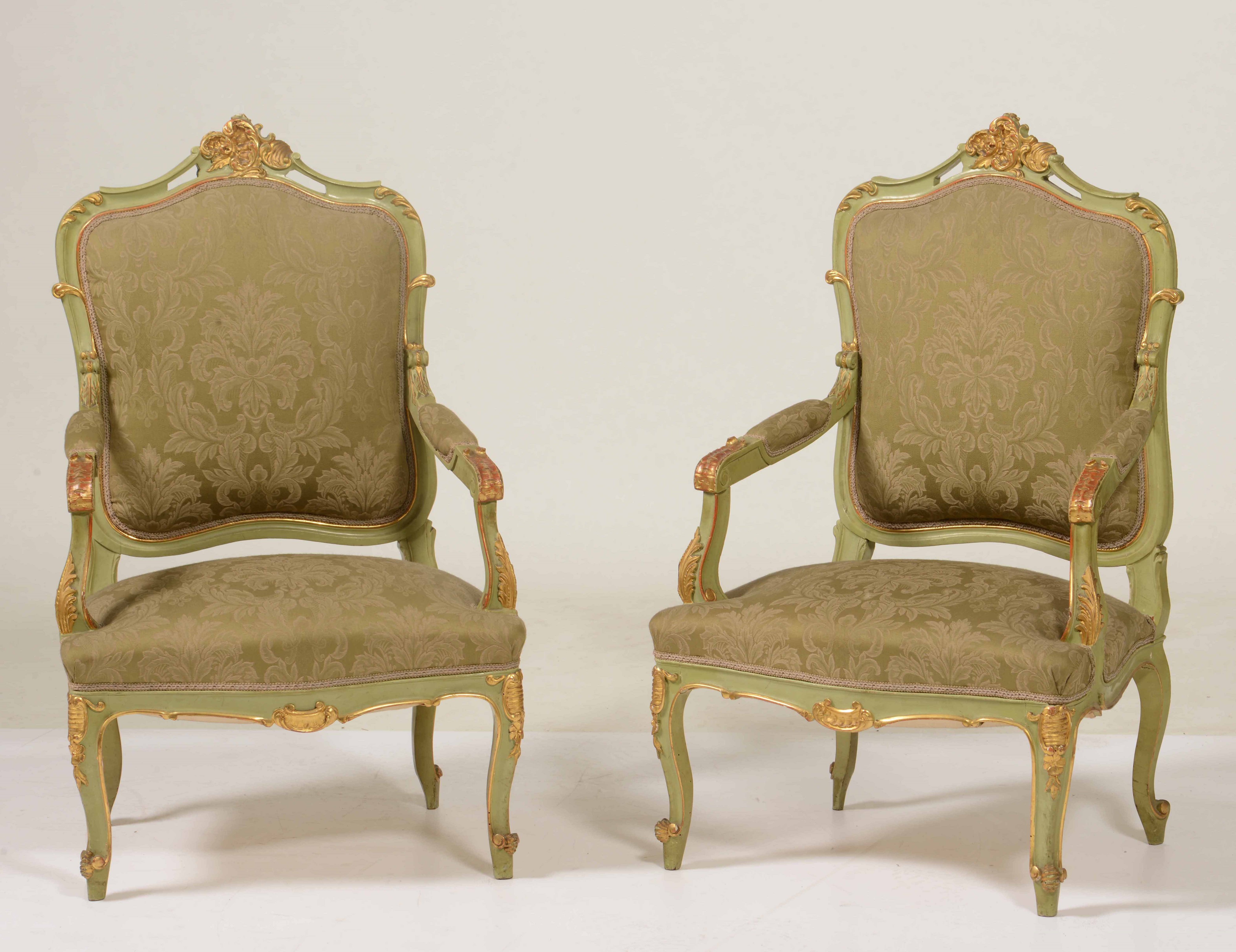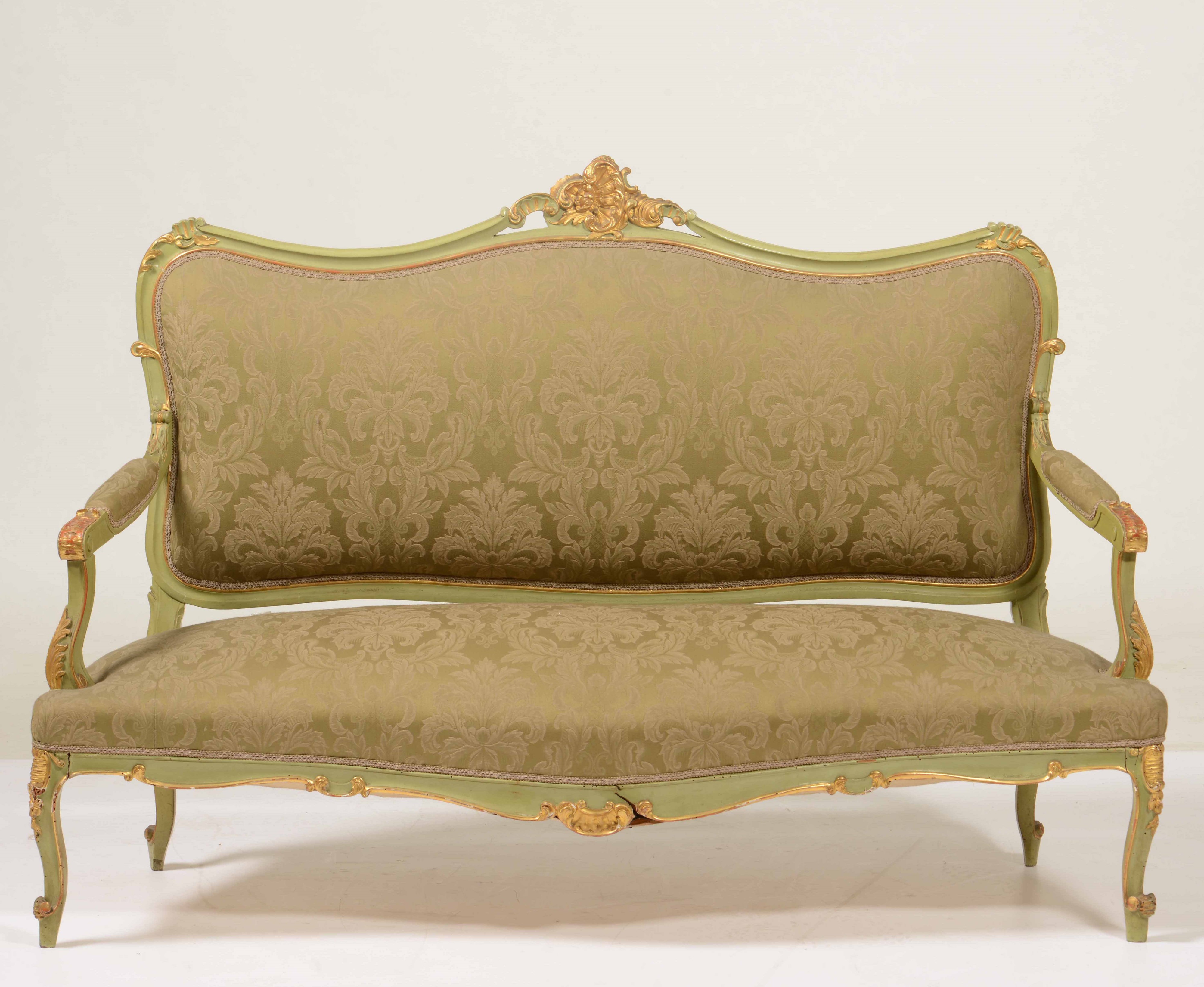 composto da divano cm 168x60x113, 6 sedie cm 53x42x100, 2 poltrone cm 67x53x110, vetrina cm 73x43x150, tavolo da centro cm 100x70x82 e fioriera con specchiera cm 120x35x270
