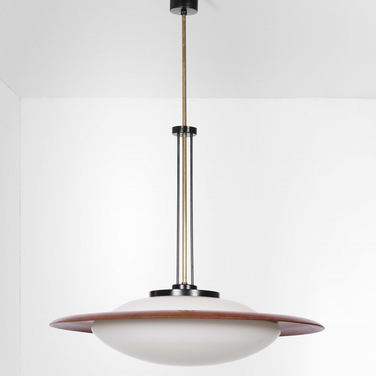 Struttura in legno, ottone e metallo laccato. Diffusori in vetro opalino.