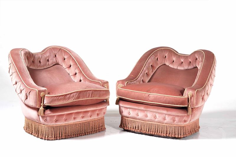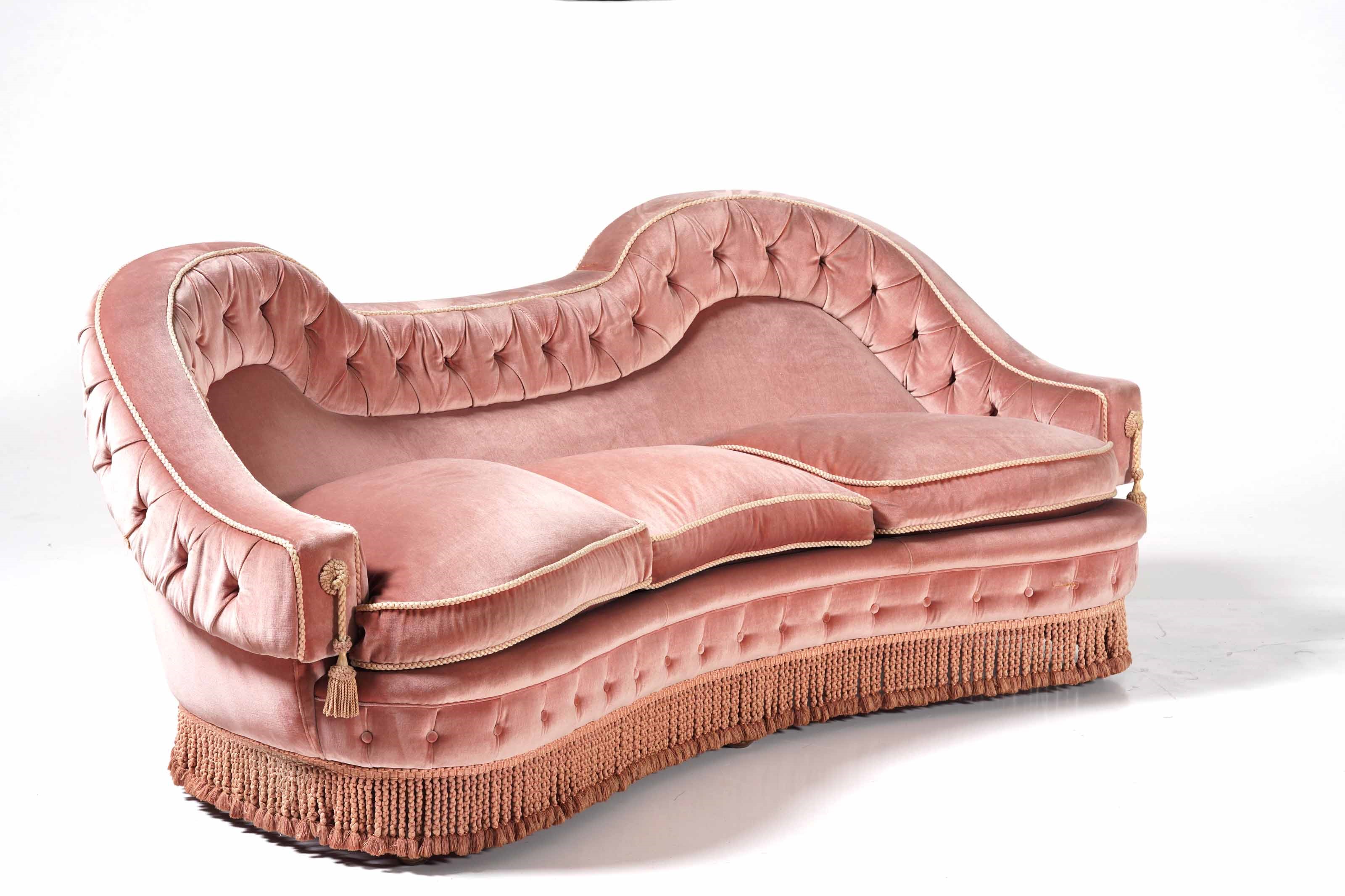 Struttura in legno con rivestimenti in tessuto e dettagli in passamaneria.