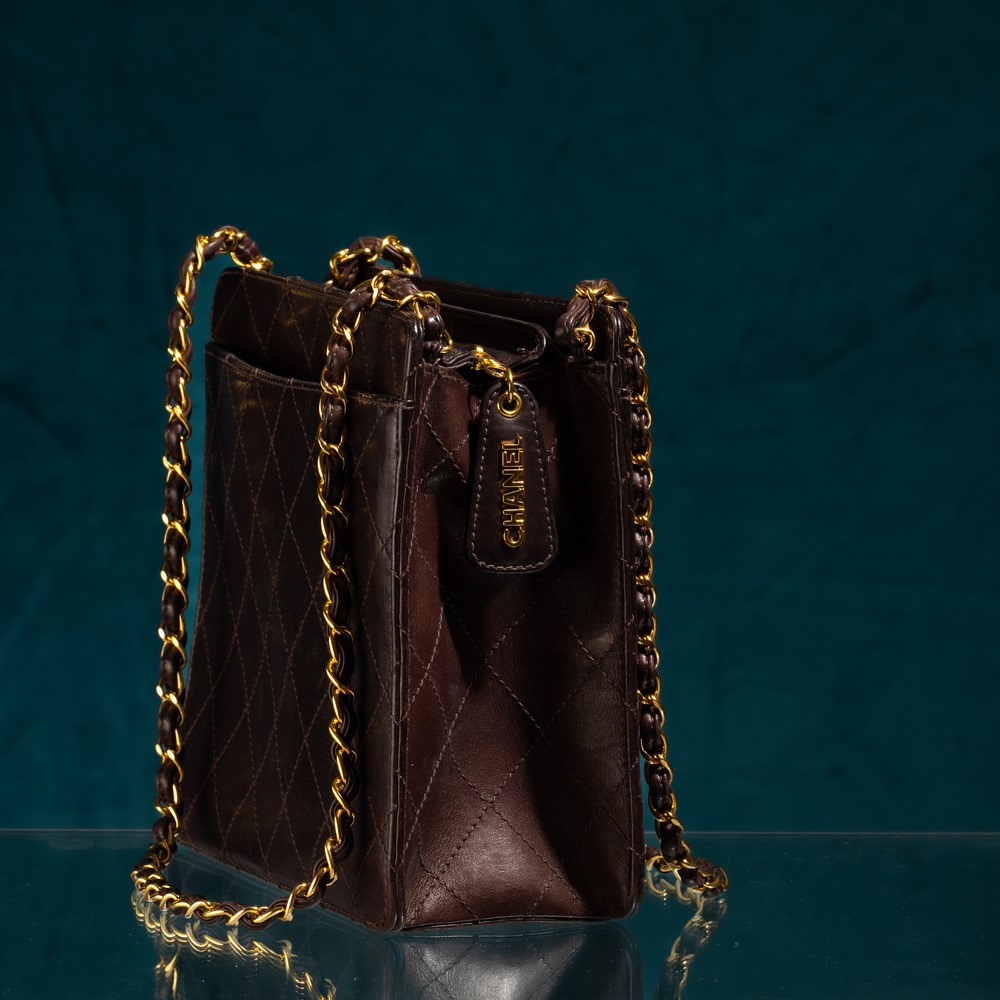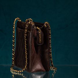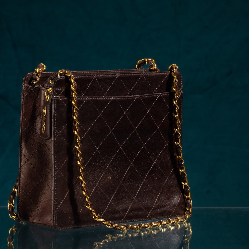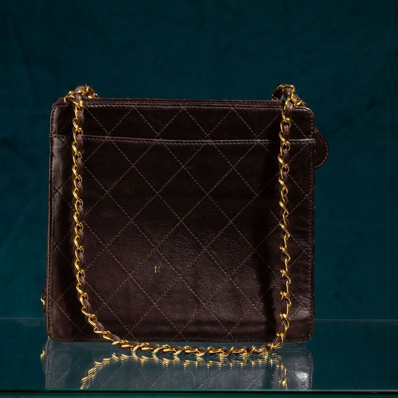 In pelle trapuntata, con catena dorata, due tasche interne, una con la cerniera e una a soffietto, segni di usura