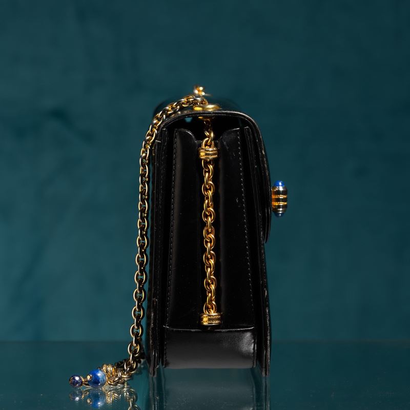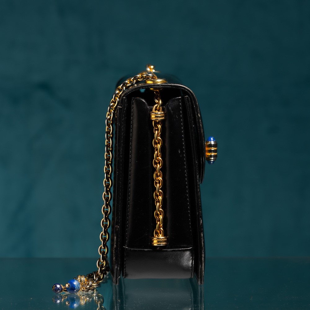 In Pelle, con tracolla dorata e arricchita la tracolla e la chiusura da pietra in lapis, ottime condizioni