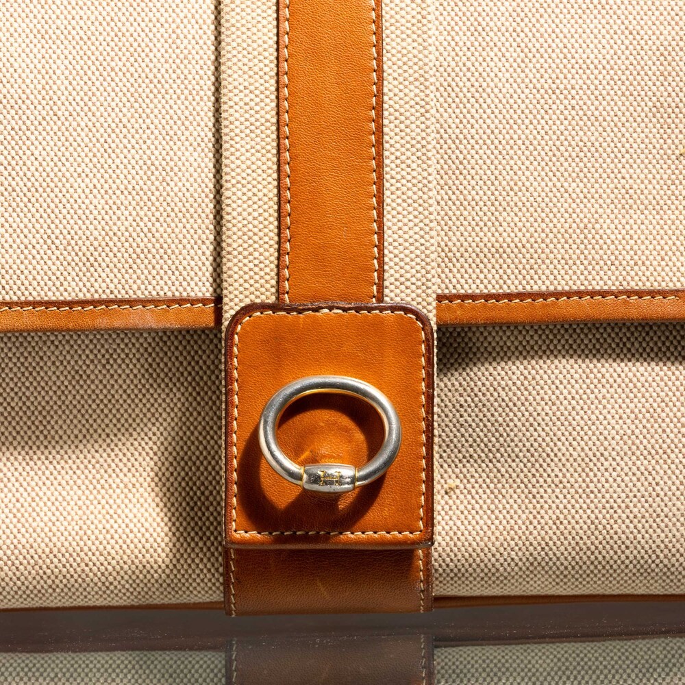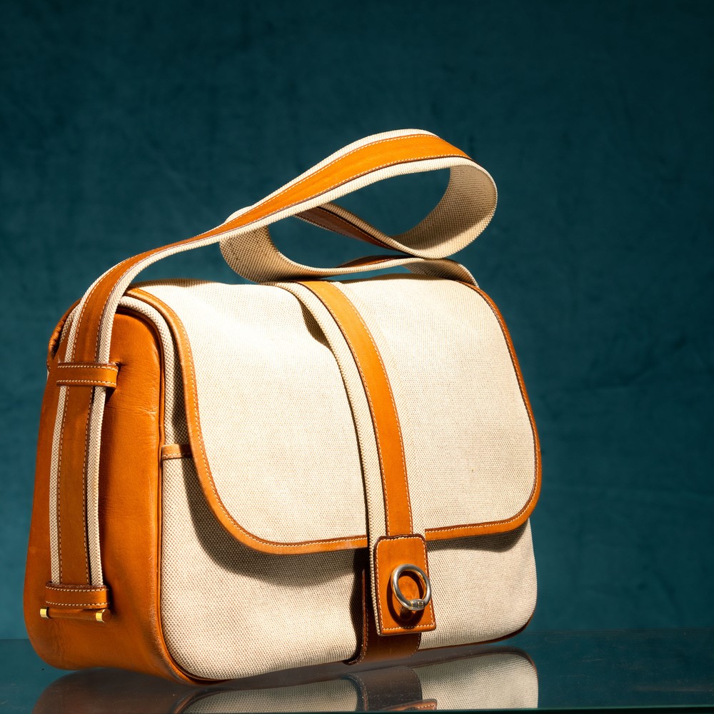 In tela beige con finiture in cuoio color tabacco, con dustbag, difetti e segni d'usura