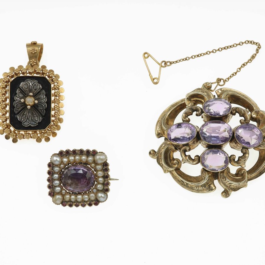 Due spille e un pendente con ametiste e perle