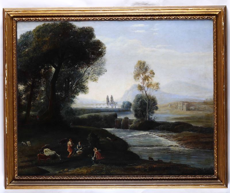 Scuola del XIX secolo Paesaggio fluviale con pastori e armenti
