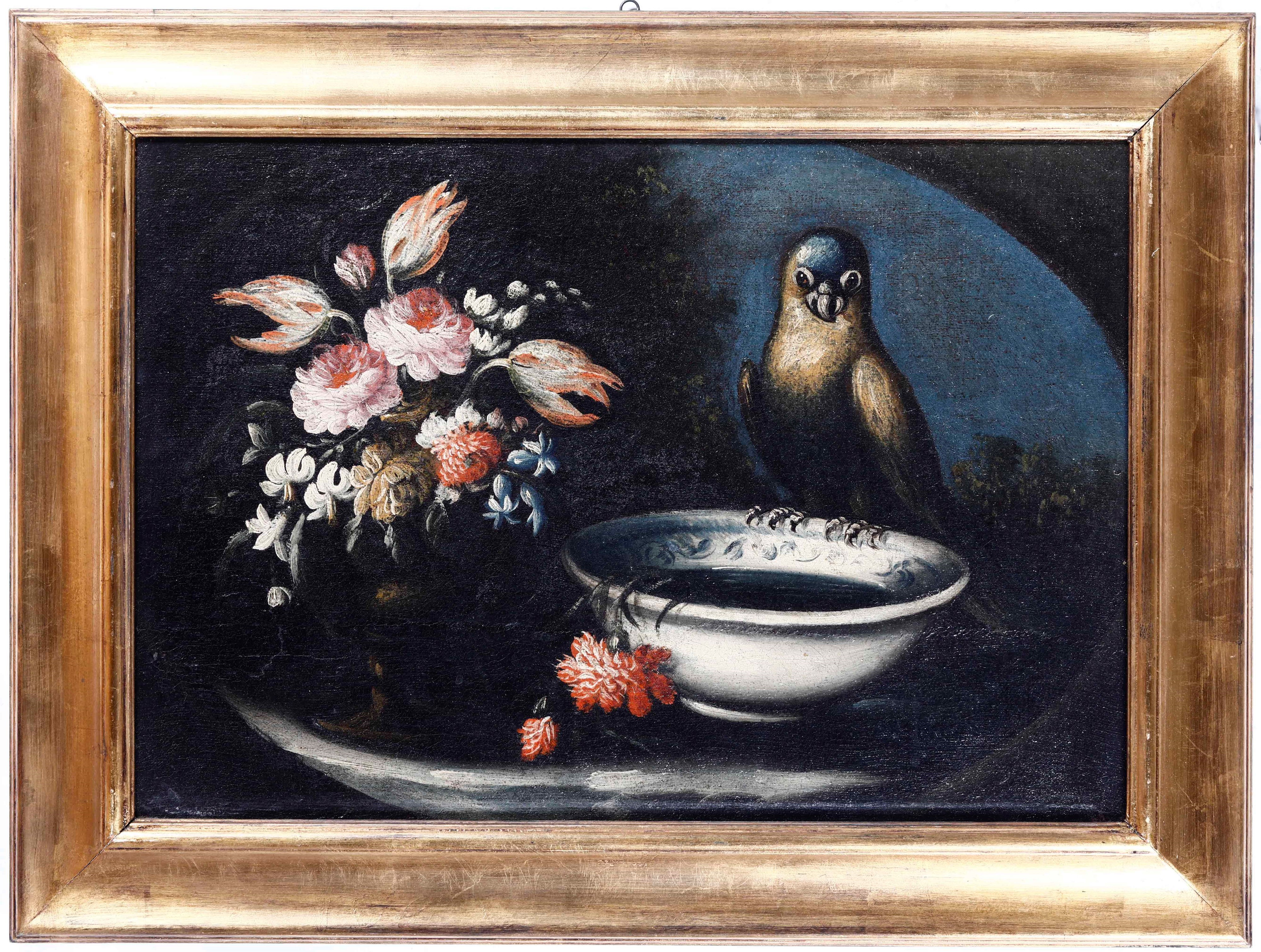 Scuola del XVIII secolo Nature morte con fiori e gallinacei