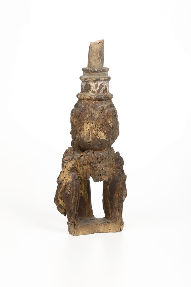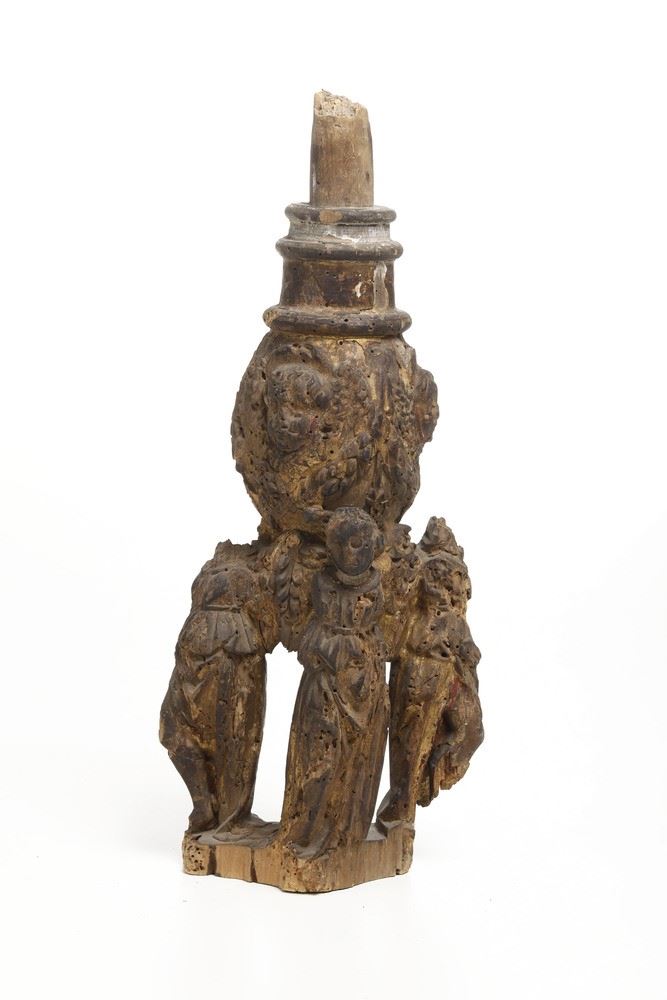 Purtroppo il tempo e l'azione di animali xilofaci ci hanno lasciato solo un lacerto di quello che fu in origine un oggetto straordinario: 4 angioli dalle lunghe vesti (di cui ne sopravvivono - mutili- solo 3) uniti tra loro dalle ali sorreggono una boccia decorata da 3 cherubini circondati da ghirlanda. Epoca, stile e altissima qualità di esecuzione rendono più che plausibile il nome del Barili che fu - al tempo - uno di più virtuosi intagliatori Senesi.